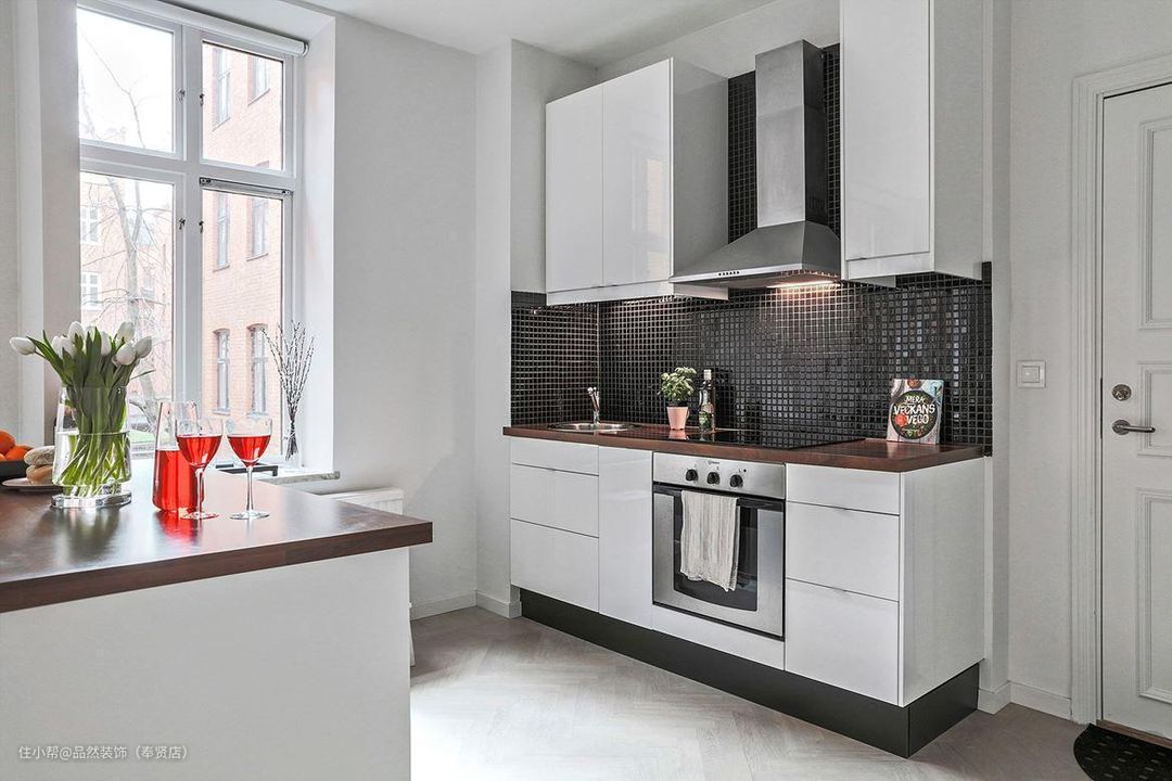 入户/厨房 首先看一下他家的入户设计,这么小的户型独立玄关就不要奢望了,还是以实用舒适为主吧!房主在门后一侧靠墙定做了一个玄关大衣柜,毕竟前面提到卧室太小,因此将衣帽、鞋子收纳都规划到入户处,为卧室释放充足的空间。 进门右侧是开放式厨房的区域,客餐厨一体化布局让各功能区共用,空间实现最大化。厨房定做了嵌入电器的白色整体橱柜,与黑色马赛克墙面搭配,经典时尚大气,满足各类厨房用具、器皿、小厨电等收纳的需要。橱柜对面还设计了中岛台,起到备餐台的作用,扩充了厨房操作空间。