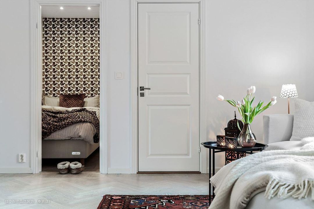 沙发右侧墙面上是两扇实木房门,左侧是卧室,右侧是卫生间,整体格局一目了然,十分紧凑。
