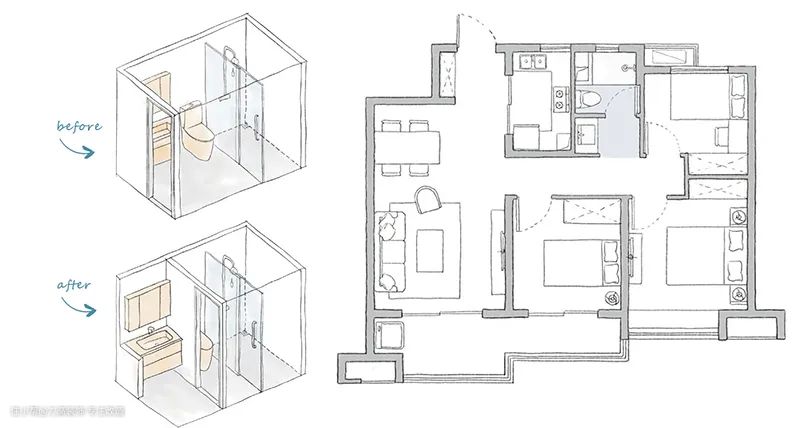 分离式卫生间的优点:① 多人使用:提高使用效率,多人同时使用互不干扰。② 更加卫生:功能区分离更便于卫生清洁,避免水汽外泄,减少细菌滋生。本案例中的卫生间是典型的二分离,也就是洗面池与马桶的分离布局。