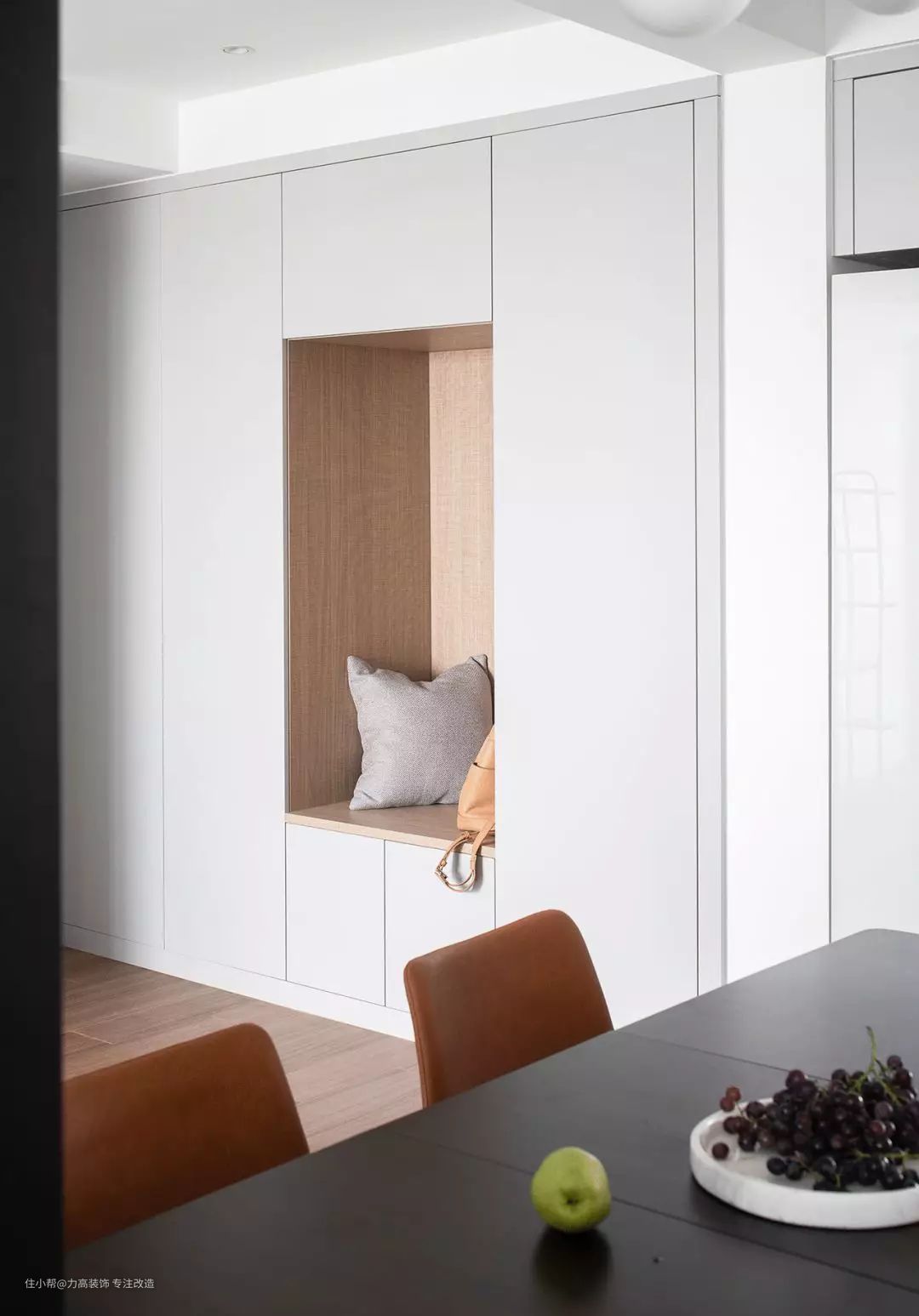 Tips:实现凹墙嵌柜的三种方法① 挪门—门开“中间”,进门两侧摆放收纳柜,既增加了储物容量,开门还不见柜体深度。常用于独立空间的改造。② 侧面建墙—在柜子侧边建墙,使柜体嵌入墙体,不见柜子侧面深度,新建墙体上还可以布置开关插座等。③ 折墙—遇到折墙,墙体两侧的凹面做柜体,和墙体保持齐平,保证视觉上的整体性和轻薄感。