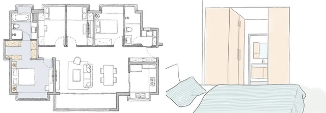 值得注意的是:凹墙嵌柜,对于空间墙体或者门的位置进行改动,适合毛坯房的空间改造。对于精装房,隐藏家具厚度可利用面的折转,将柜体深度可见面做成开放柜,这样可以在视觉上消减柜子的厚度。