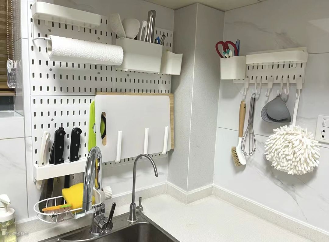 如果想要洞洞板发挥更大的作用,也可以选择将洞洞板装在燃气管道这里,既“遮丑”,还能收纳,一举两得。