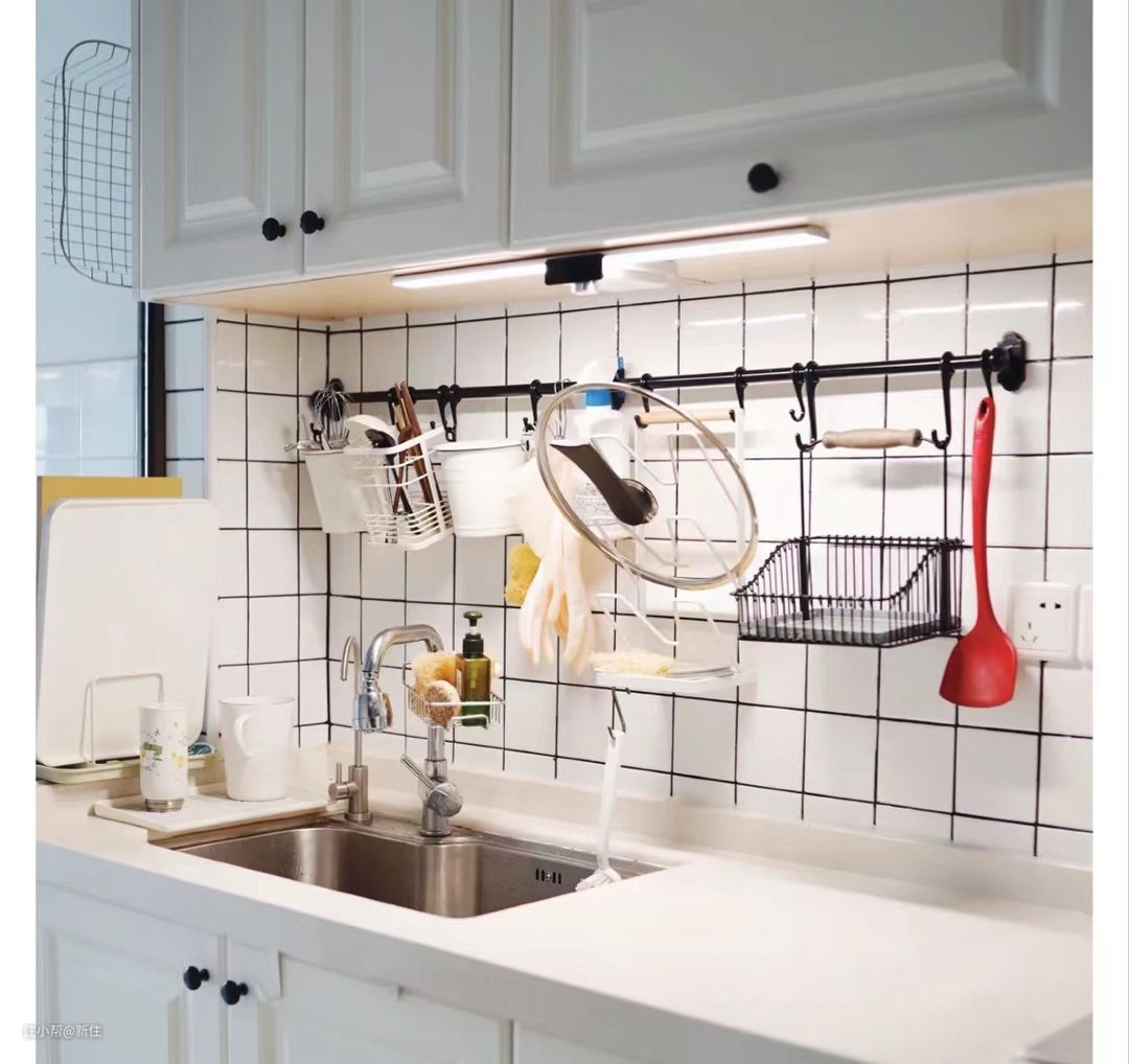 算是比较好操作的方式了,把挂杆固定在墙面上,就能把各种铲子、抹布之类的挂上去了,收纳力同样也很不错。