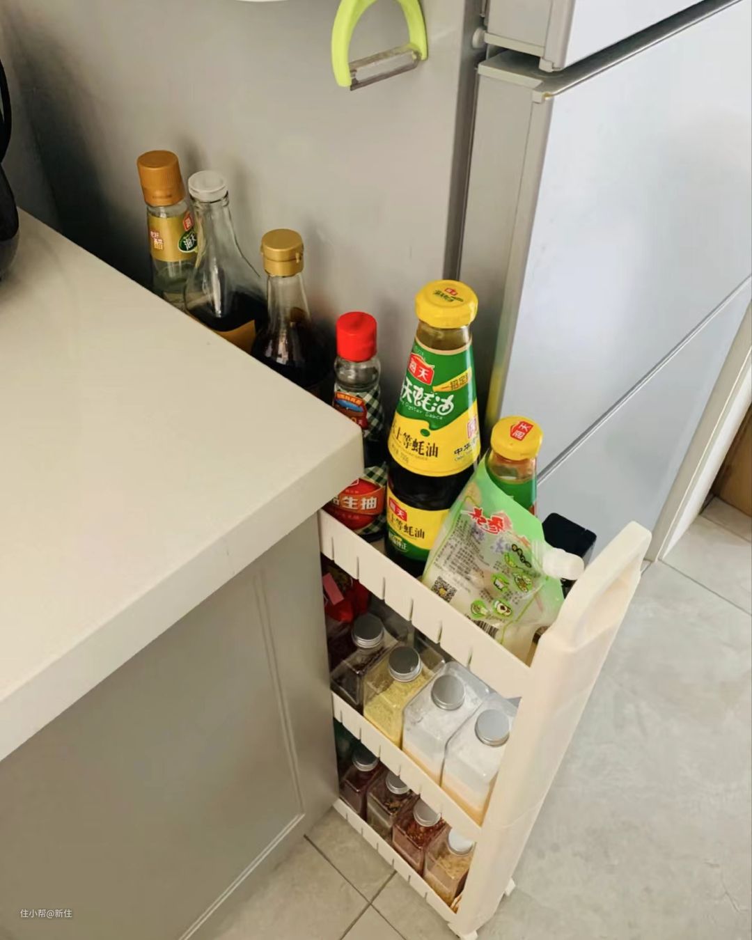 如果冰箱和台面挨着,中间的缝隙就建议放这种开放式的小推车,调味品放在里面,既整齐,又一目了然好拿取。