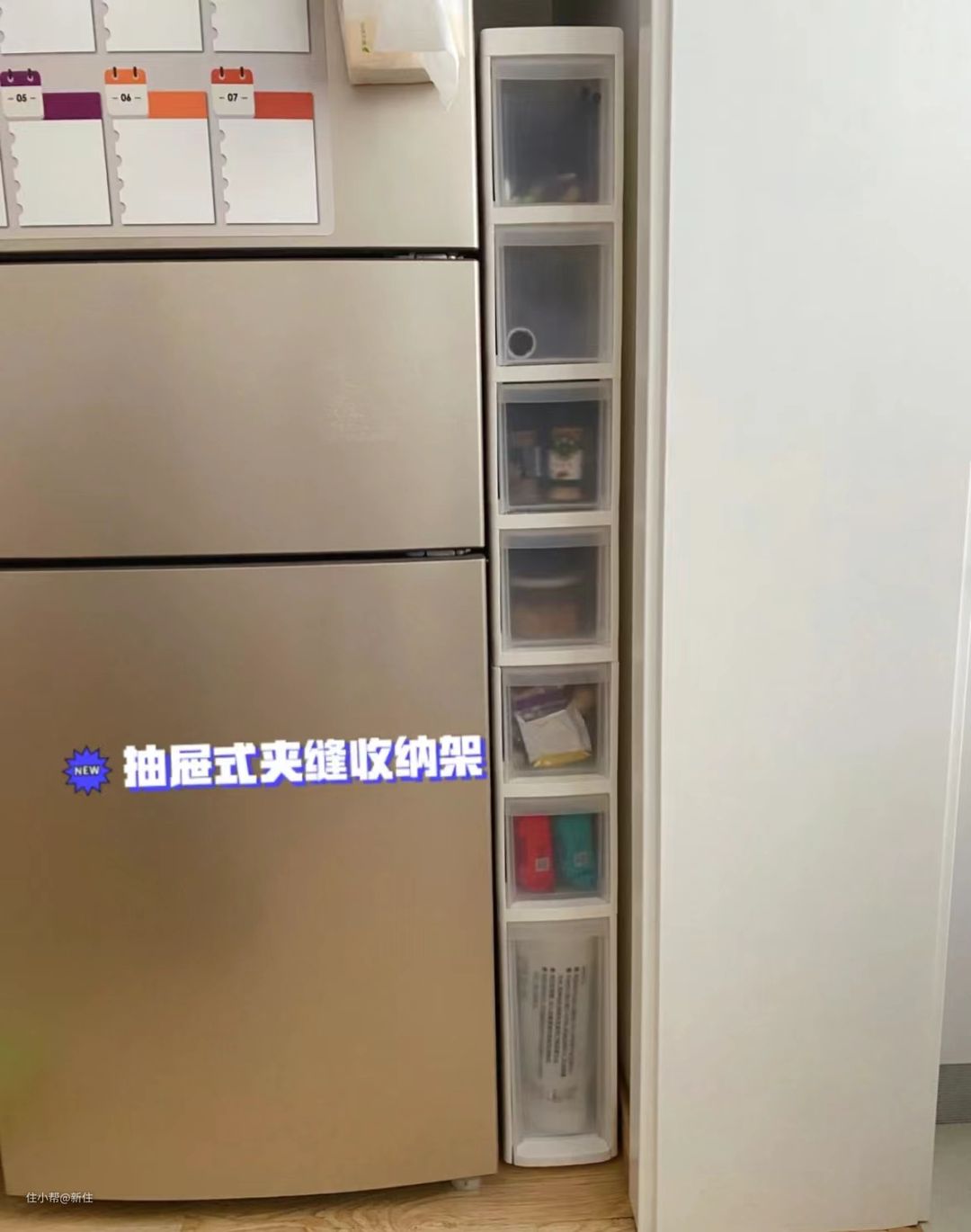 可以安排一个抽屉式夹缝收纳架,把厨房的一些袋装调料、小杂物等收纳在这里,底部还带有滑轮,拉近拉出也方便。