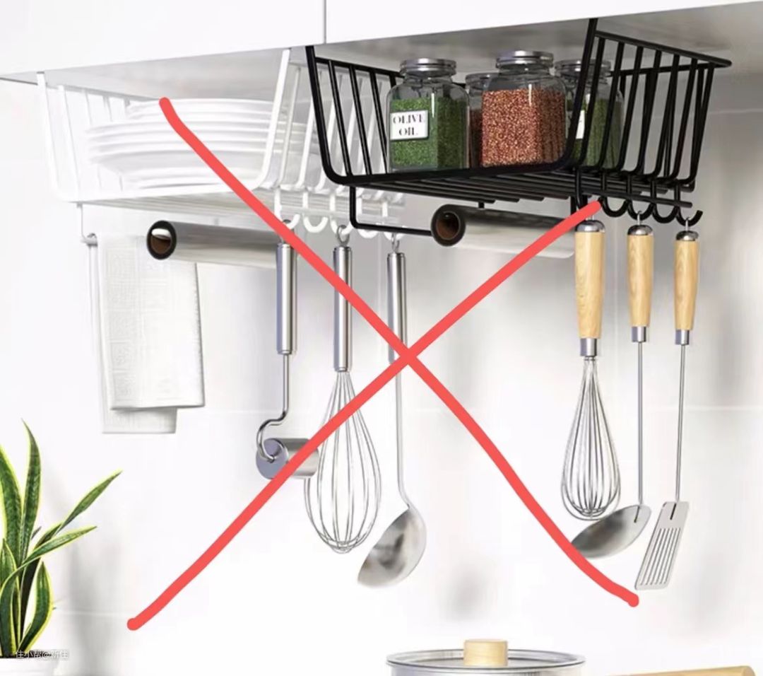 但并不建议过度收纳,就比如下面这种挂架,虽然能放很多东西,但卡在吊柜上会影响柜子开合,再就是如果放比较重的物件,总给人很不安全的感觉。
