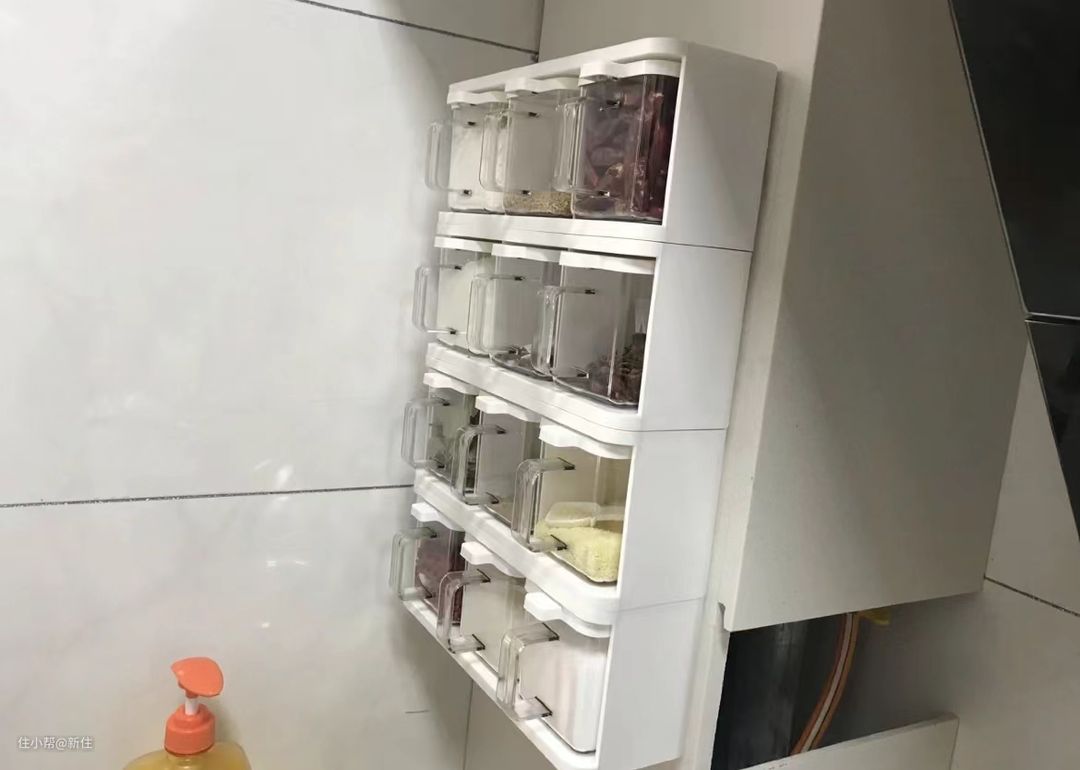 调料盒是厨房每天使用最频繁的物件之一,如果放在抽屉里就需要不停开合抽屉,并不方便,放在台面上又占空间,因此,将其挂在靠近灶具的墙面上,无疑是一种非常折中的方法。