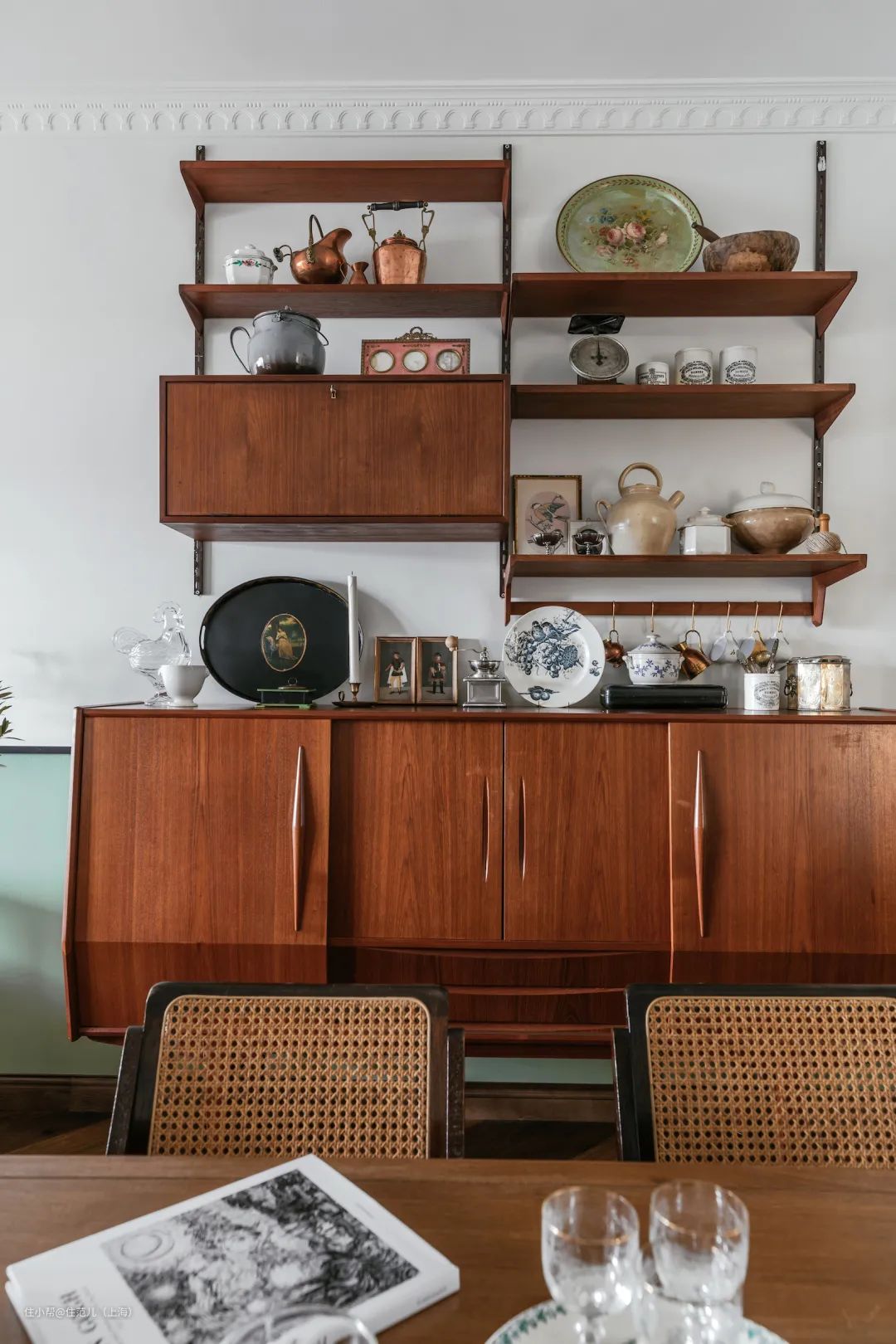 餐桌边上的深棕木色柜体,平开收纳柜和上墙式开放式置物架结合,有丹麦设计大师 Johannes Sorth 招牌秘书柜的味道。