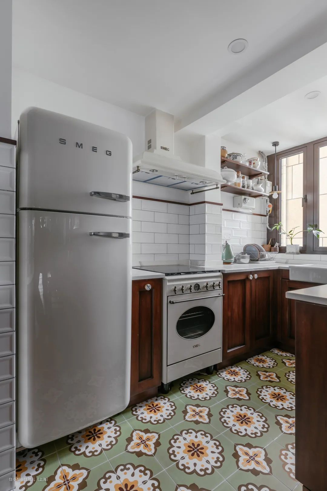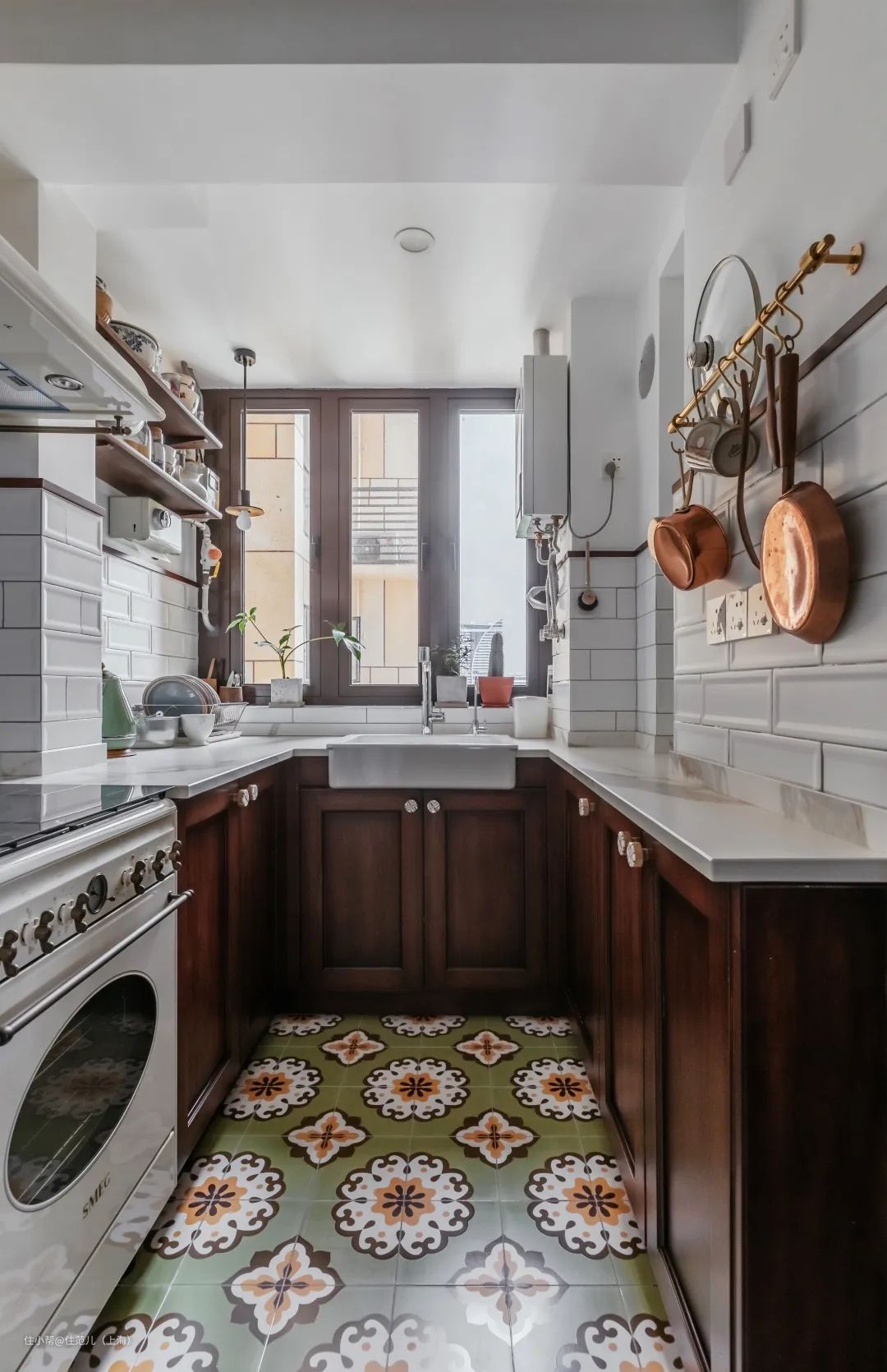 天然木色和白色组合,搭配自带复古元素怎么搭都好看的小花砖,黄绿色调自然形成空间一抹轻松感。