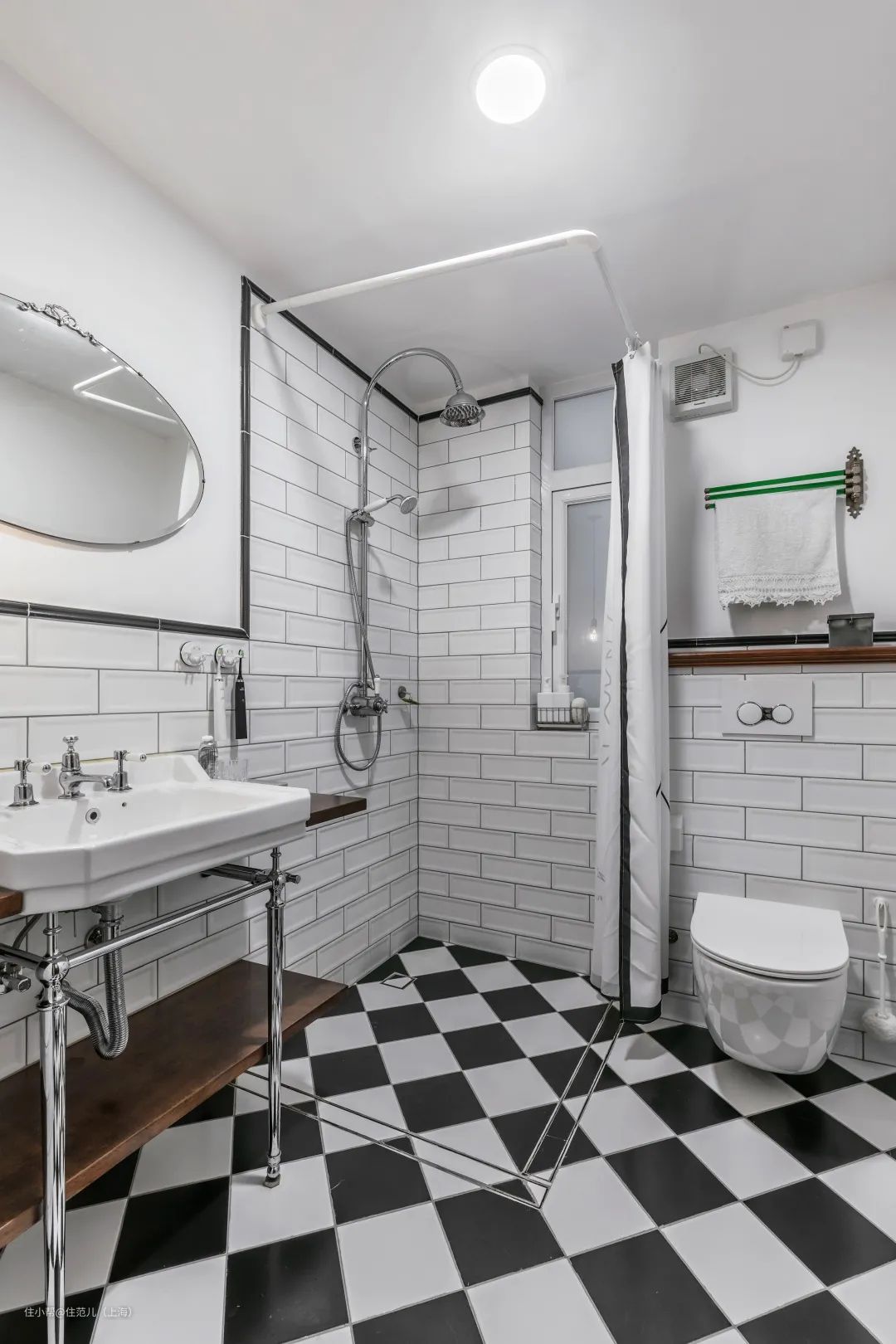 卫浴用几何地砖与小白砖组合,搭配亮银五金件彰显黑白格调的简约时尚,从细节处窥见屋主的小心思,你们发现没就连毛巾架都是草绿色的点缀。