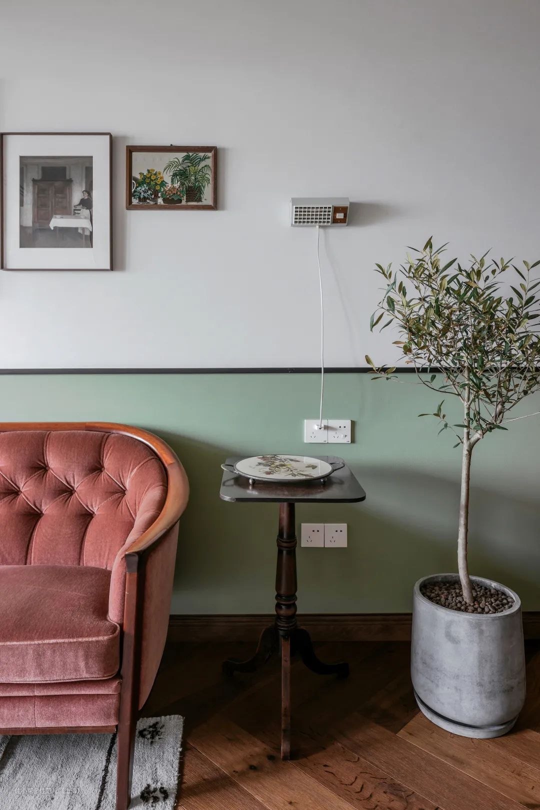 半墙绿漆半墙白漆,用黑色线条加深对比和复古印象的深化,与屋室线条框架感家具相呼应。