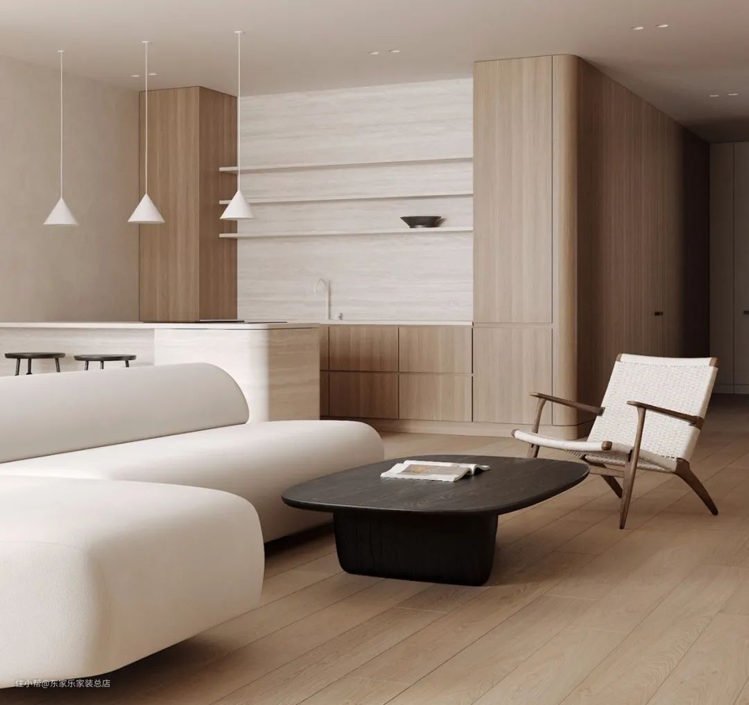 如果选择千篇一律,棱角分明的桌柜茶几,只会让整体的氛围感觉沉重、生硬,而在家具的造型上可以有更丰富的设计感,桌子茶几等等可以采用曲线弧形,或者不规则的曲线线条,也可以倾向于椭圆、正圆等等,这些充满流畅线条感的造型,让整体氛围更加灵动。