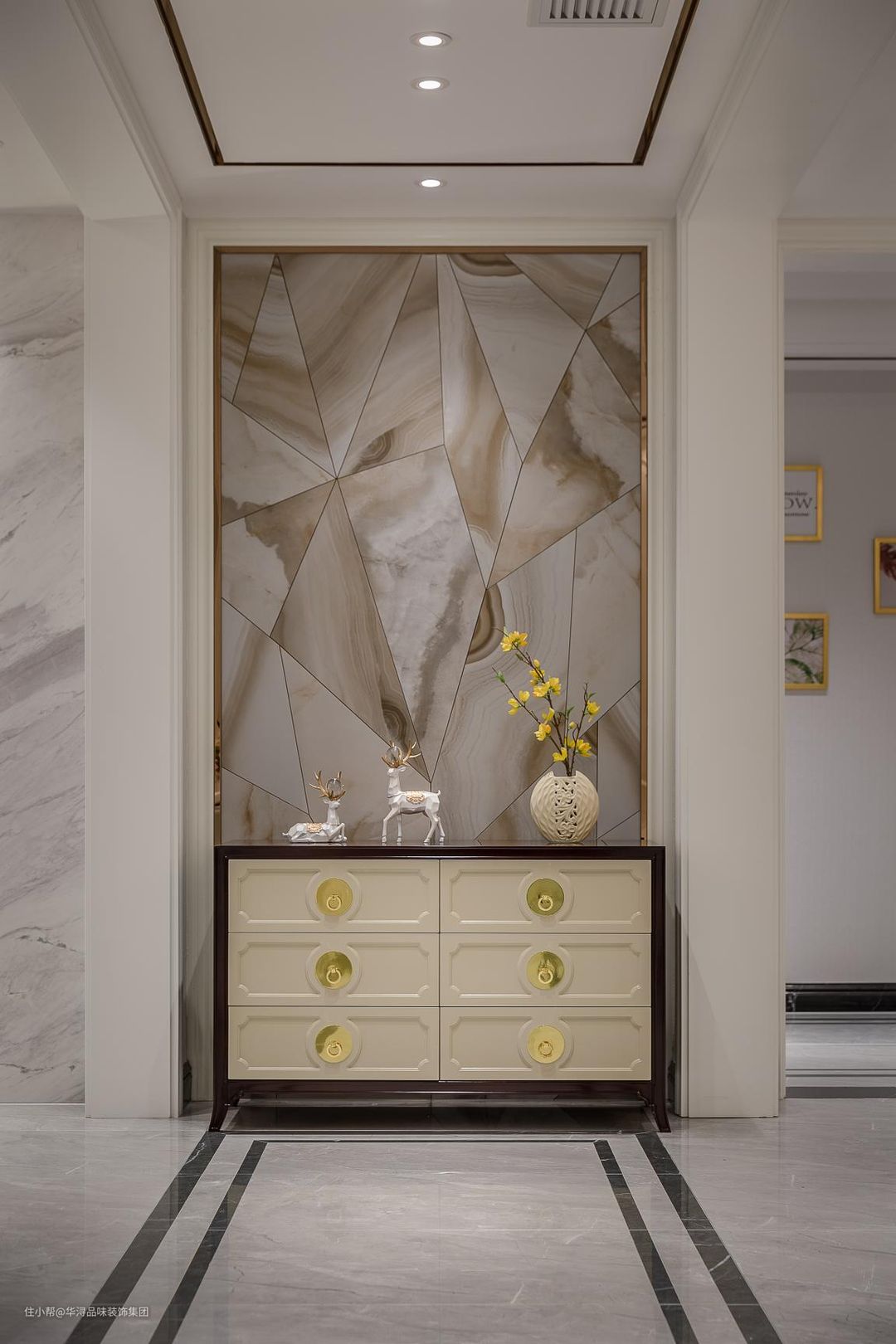 抬头看去,正入眼帘的玄关背景墙上采用不规则图形的现代装饰画与收纳柜相互搭配,取得和谐优雅的效果,装饰颜色选择主要以金色为主,将美式轻奢发挥得淋漓尽致。