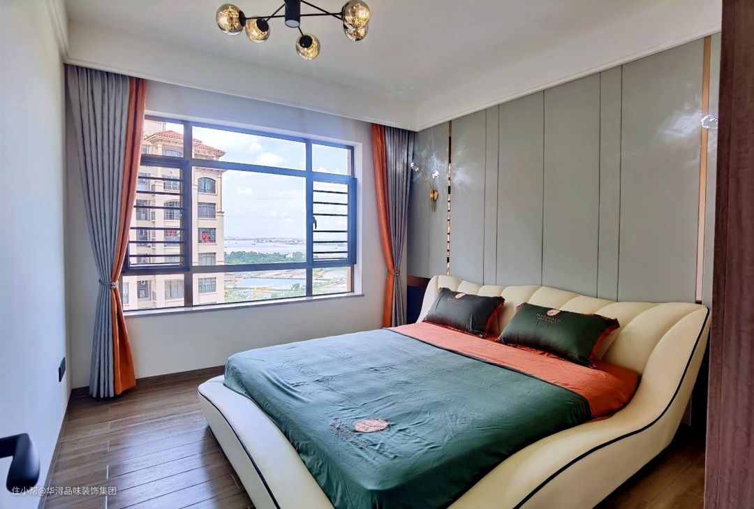 主卧就是现代轻奢风格,没有多余的装饰,简简单单的大床房加大窗户,大而舒适,有型的窗户,可以得到最大的光亮和通风效果,加上蓝色和橙色的窗帘,温馨自然。墙壁是木饰面和科技乳胶漆,都是属于光滑细腻的材料,两种材料都是防尘防潮。