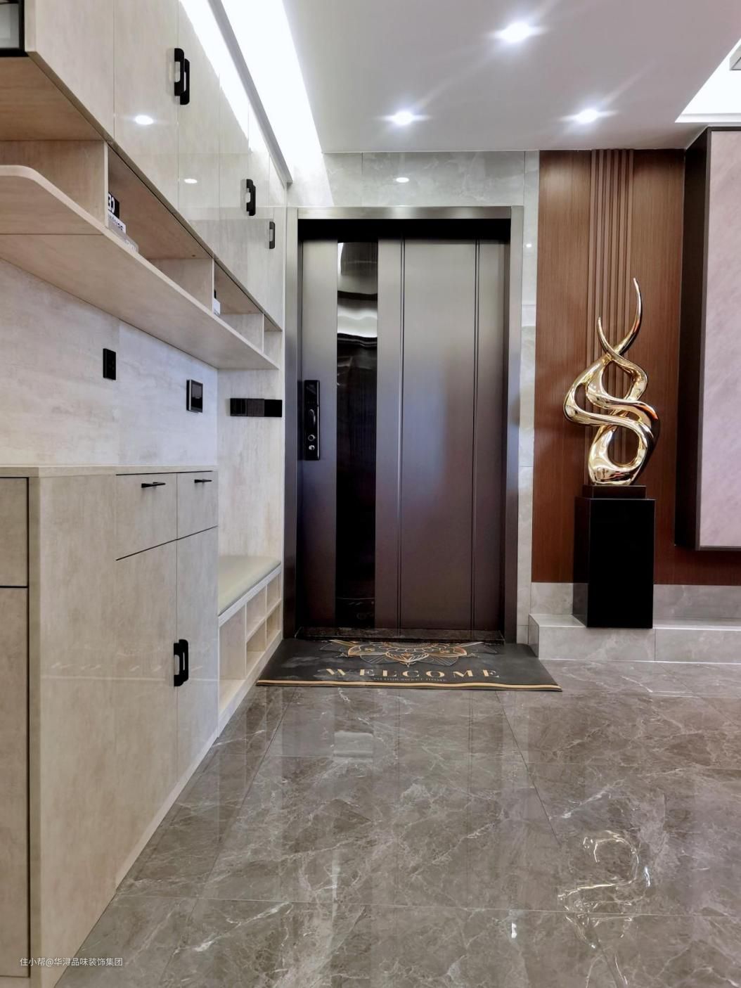 因为是电梯入户,所以没有设置楼梯,地毯是暖暖的气氛,整个入户门厅是属于高级装饰,走线条感,干净整洁。