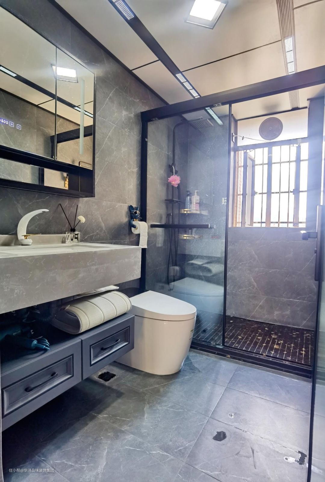 主卫就是高级舒适,以灰色为主,灰色的哑光砖,高级透气,洗漱台下是装洗漱用品的,区域分明,各有各的归属,整个空间就非常和谐舒适,再加上干湿分离的设计,卫生间可以保持干净整洁,简单明了。还可以很好地保护家电安全以及家人的身体健康安全。