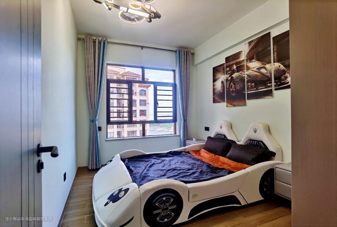 男孩喜欢跑车,天天梦想着有一个自己的跑车,设计师借鉴电影中的一个情节,特意给小朋友一个惊喜,一款跑车型的床,让他梦想成真,背景墙使用浅绿色的科技乳胶漆,让空间变得非常温馨舒适。