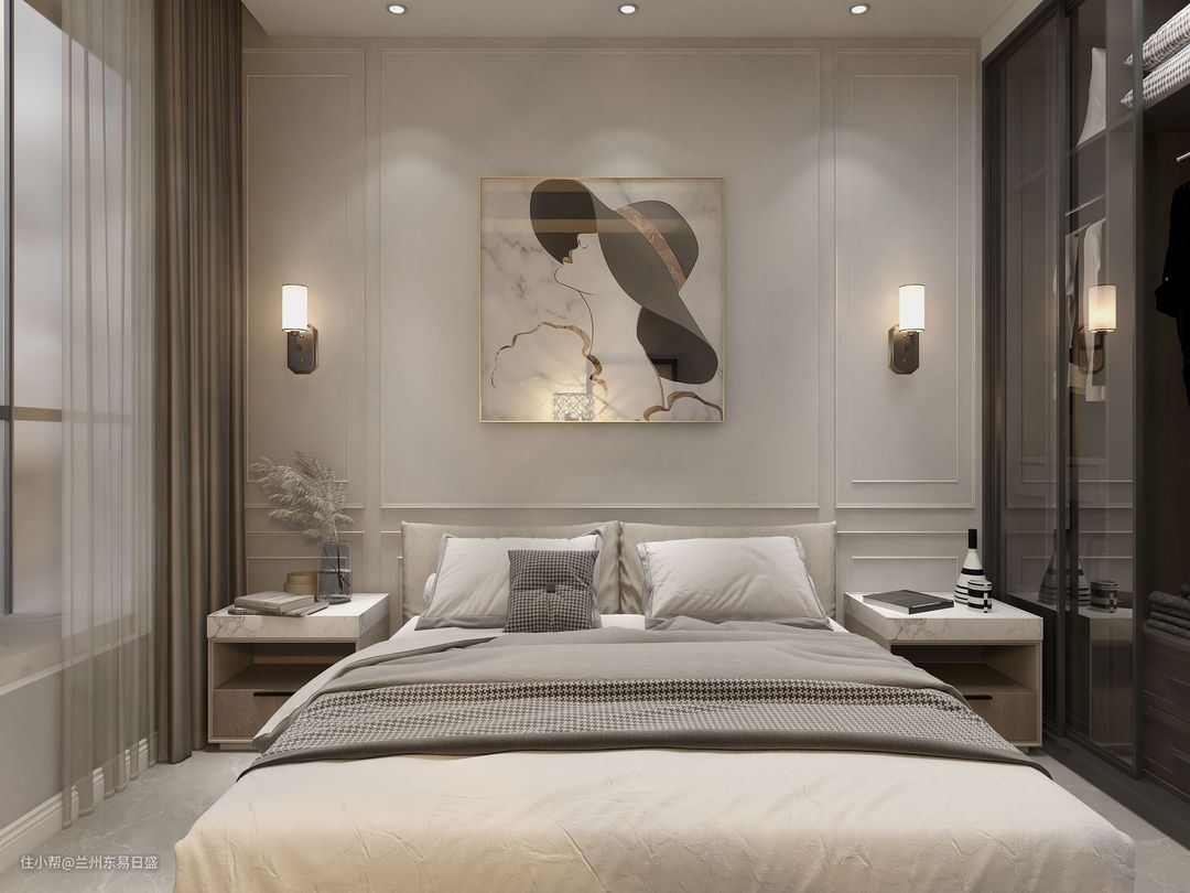 卧室维持了素雅的米白色基础,令人温情舒适,再点缀上饰品的细节,装饰出安静优雅温馨的房间。床头墙挂上一幅同色系的装饰画,显得安静而又祥和舒适。旁边的衣柜也是以玻璃门隔断,隔尘的基础,又方便了查找衣物的体验。
