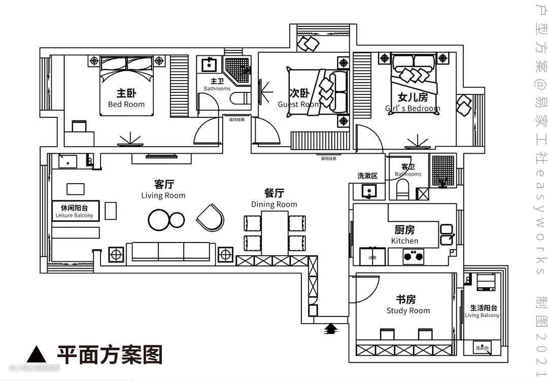 ● 阳台收入客厅,客餐厅+阳台形成通透格局;