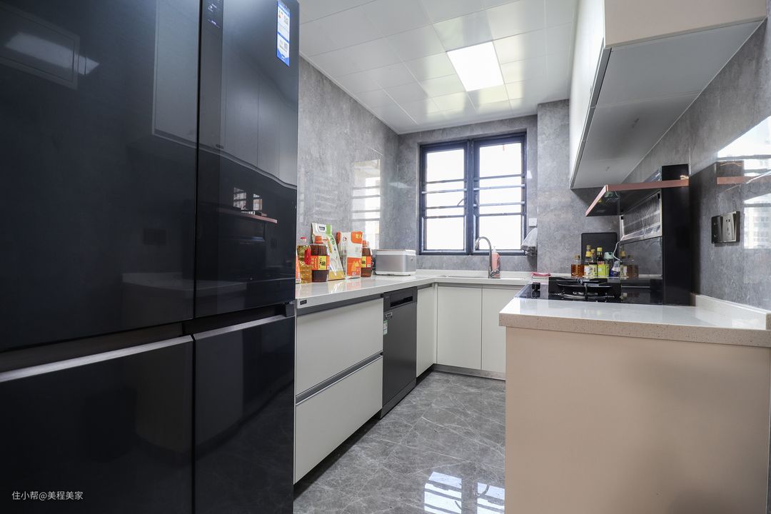 玻璃推拉门相隔的传统中式厨房,是一个U型格局,大大增加了空间感和动线的流畅性,即通透又相互独立,避免油烟过分侵扰公共空间。纯白色的橱柜配色,好看又干净整洁的烹饪环境,操作动线嵌入集成灶、洗碗机和冰箱,一家人的柴米油盐酱醋茶,让生活品质得到享受性的提升!