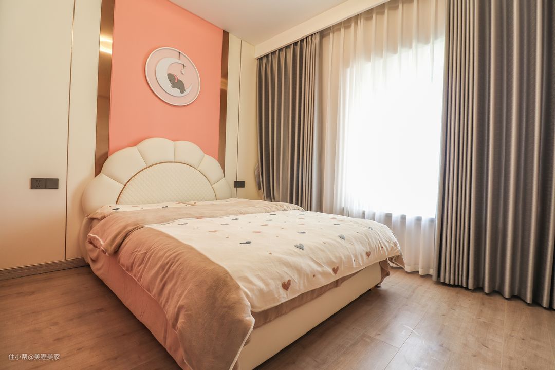 女儿房同样采用手工艺术漆搭配金色钛金条的组合,简洁鲜明的线条感,定制衣柜面板的图案和背景墙,装饰画相互呼应。只是风格却大相径庭,采用粉色系和橙色给卧室带来童真,符合这个年龄女孩的心境和爱好,一抹灵动的画面,一丝柔软的材质,营造出更适合的氛围感。