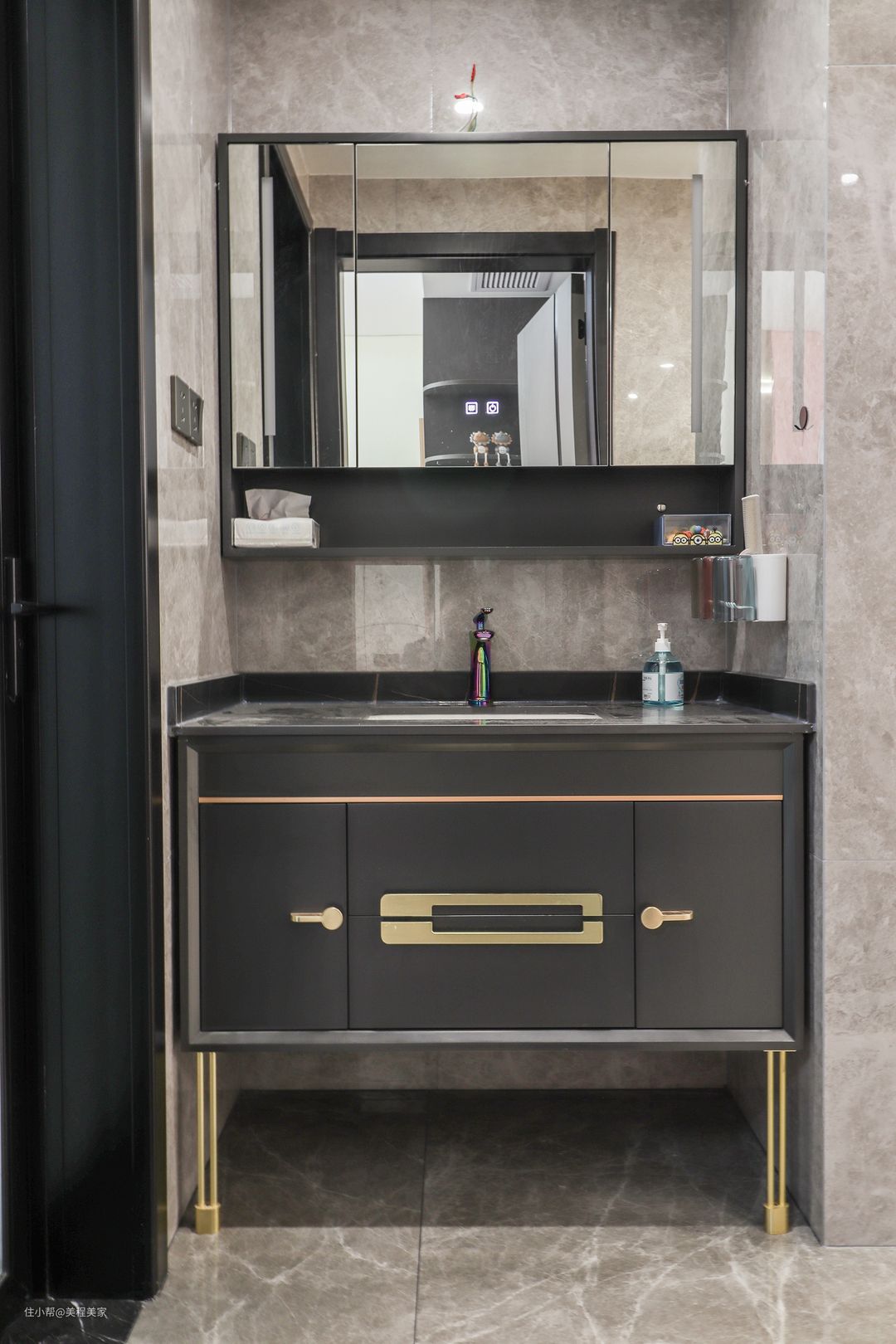 公卫做了完美的干湿三分离,从洗漱区-马桶区-淋浴区有序依次展开,外置嵌入式洗漱区的浴室柜,是一体式台盆和悬空细脚设计的,深色搭配金属设计,不仅仅美观大方打扫起来也是一等一的方便合理,没有卫生死角。与颜女士的生活哲学,如出一辙。