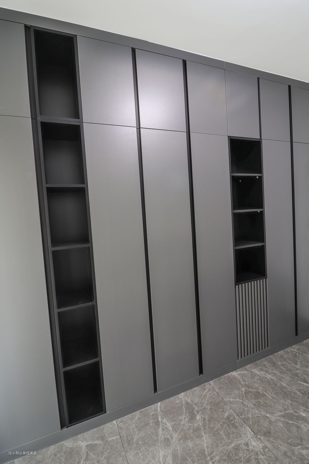 在入户的另一个区域导向了书房和生活阳台,两者相通用窗帘进行隔断,保持视野通透的同时又保证了单个空间的独立,一整面墙的定制书柜,用的哑光深灰色面板,封闭式储物搭配开放格书架,是一个黄金“7分藏,3分露”的比例,这样会更加的实用和方便整理打扫。
