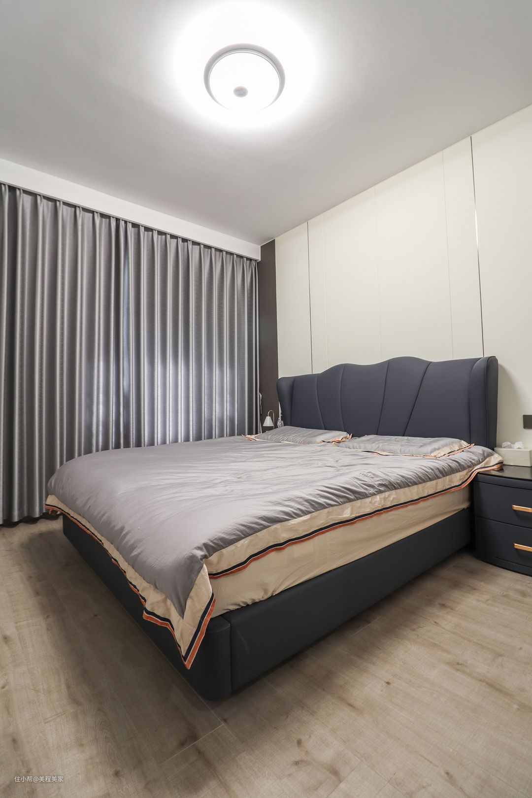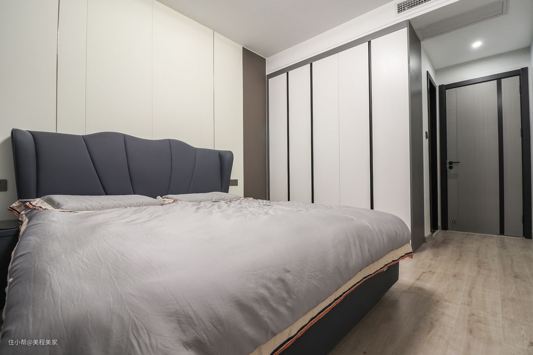 主卧延续现代简约的设计感,睡眠区以静谧舒适性为主,基调运用了白+咖色手工艺术漆,黑色钛金条进行装饰,增添些许美感,靠墙的定制衣柜是白+黑的面板搭配,木地板也采用了中更加接近原木的样式,表达最纯粹材质的变化。
