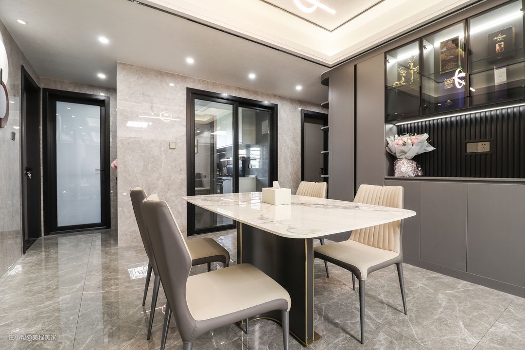 餐边柜采用中性的深灰色哑光柜体,是这个空间的主要储物功能,主面线条感和边缘圆弧造型,柔和了空间动线和视觉差次感。开放格墙体融合格栅板,玻璃柜门隐蔽下的线条灯。满足各种收纳需求也具备一种观赏性。