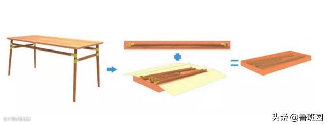 相对全可拆装榫卯结构家具而言,局部可拆装榫卯结构家具的加工成本可能会高一些,但结构相应会更加稳固。如将局部可拆装榫卯结构应用在新中式休闲桌上,在保证新中式休闲桌更牢固的同时,可以将休闲桌的包装空间降到最低,达到了降低运输成本的目的,如下图。