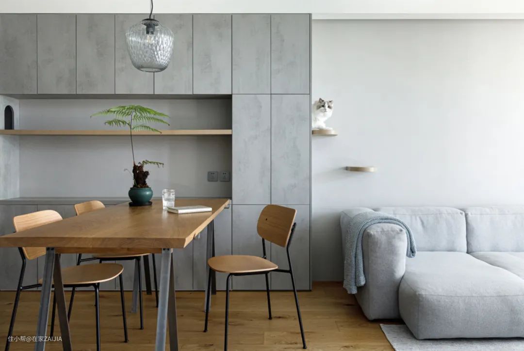 屋主家的餐桌日常使用率并不高,考虑到日常会有居家办公的需求,所以我们将书房与餐厅的功能做了结合,来提升餐厅使用率,并利用一组多功能柜体,将猫咪在家的活动形式也考虑在内了。