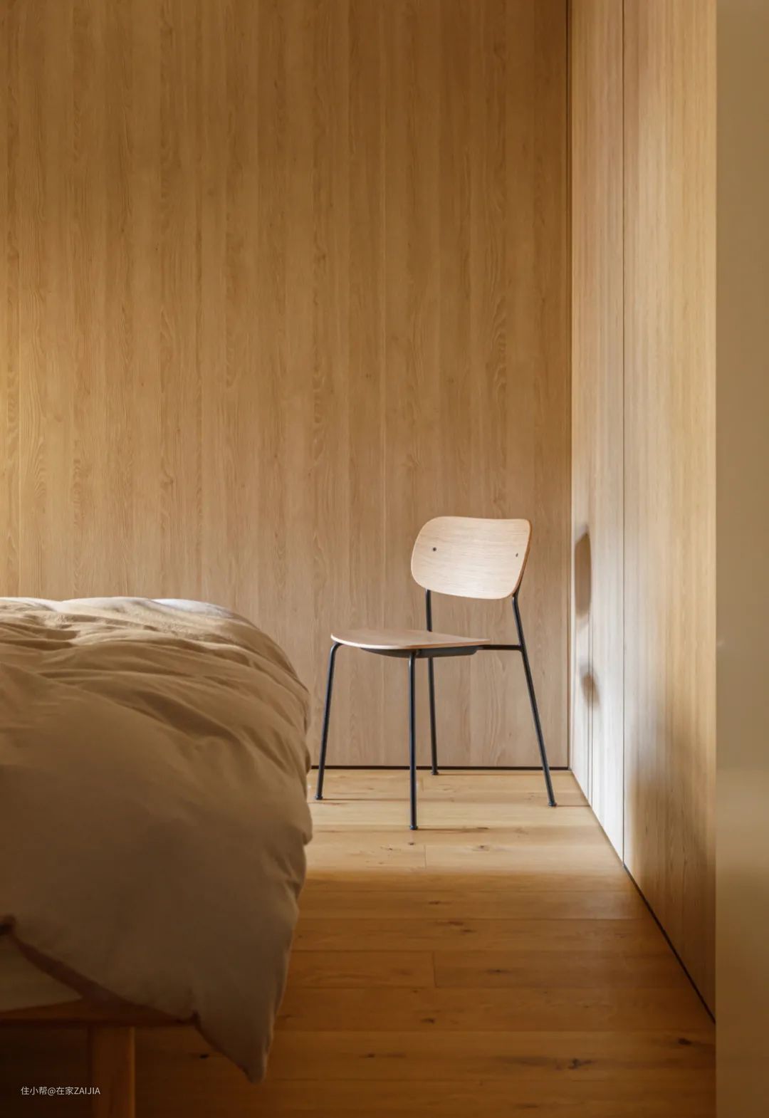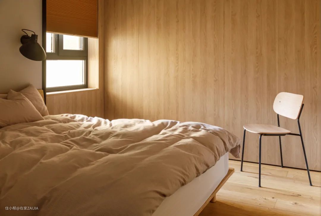 次卧的采光不算好,所以我们将房间一分为二,采用木色+白色作为空间主调,靠窗区域设置木色,光线通过反射能让整个空间都看起来暖洋洋的。