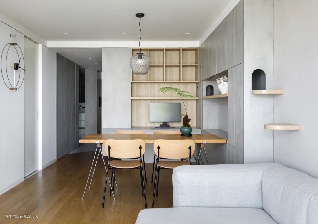 考虑到屋主有居家办公的需求,我们将餐厅与书房结合,并利用一组多功能组合柜,结合猫咪爱登高的习性,将猫咪活动区也设置在了这里,猫咪可以不经过餐桌,通过客厅的隔板到达书桌,与主人交流互动。