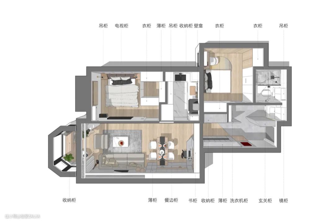 ○ 次卧隔墙内推,新增洗衣区和玄关衣柜收纳;