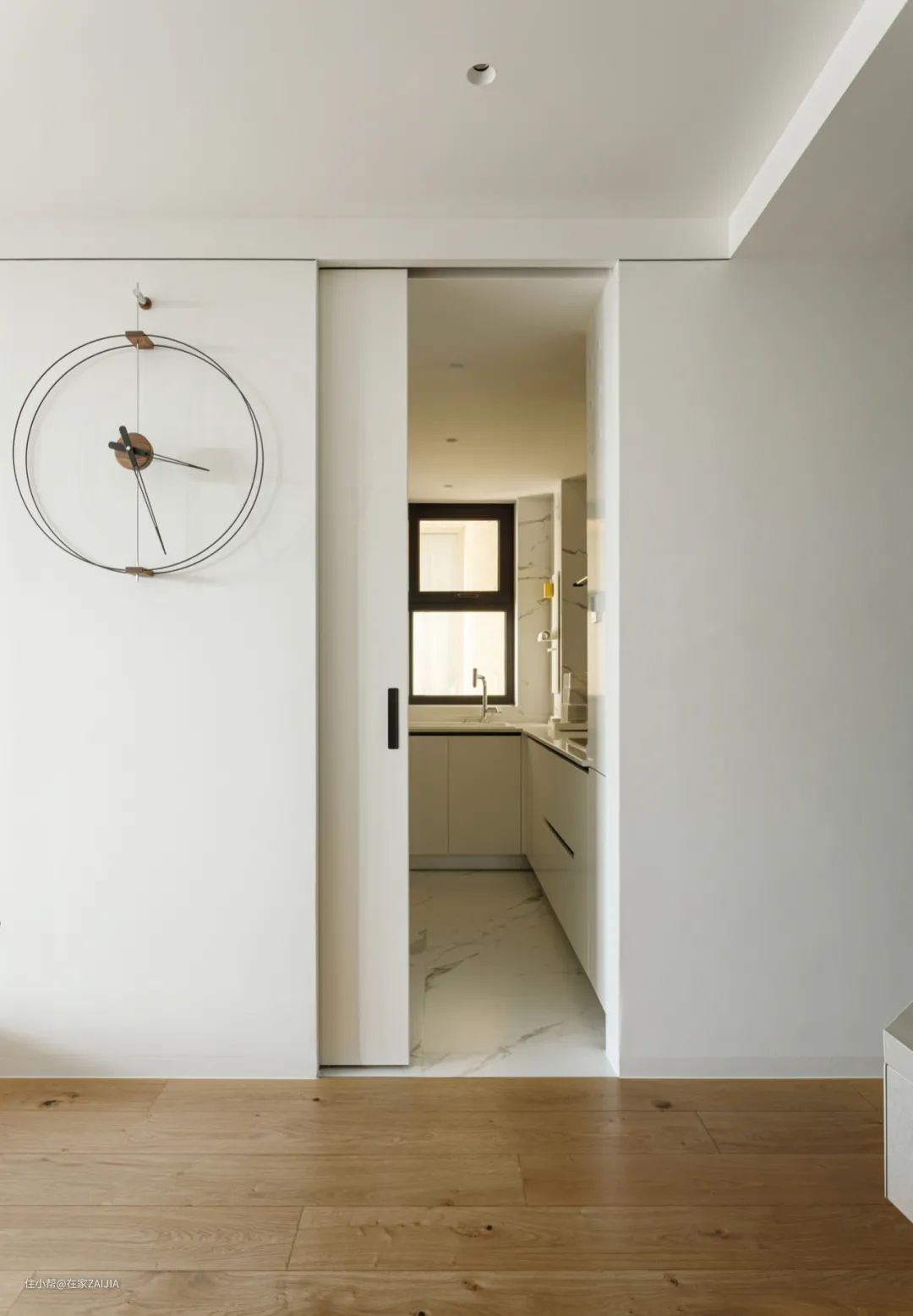 餐厅对面就是厨房,是个相对紧凑的长方形空间,为了能放下冰箱,我们选择了更节省空间的推拉门,尽可能保证厨房内部使用空间的完善。