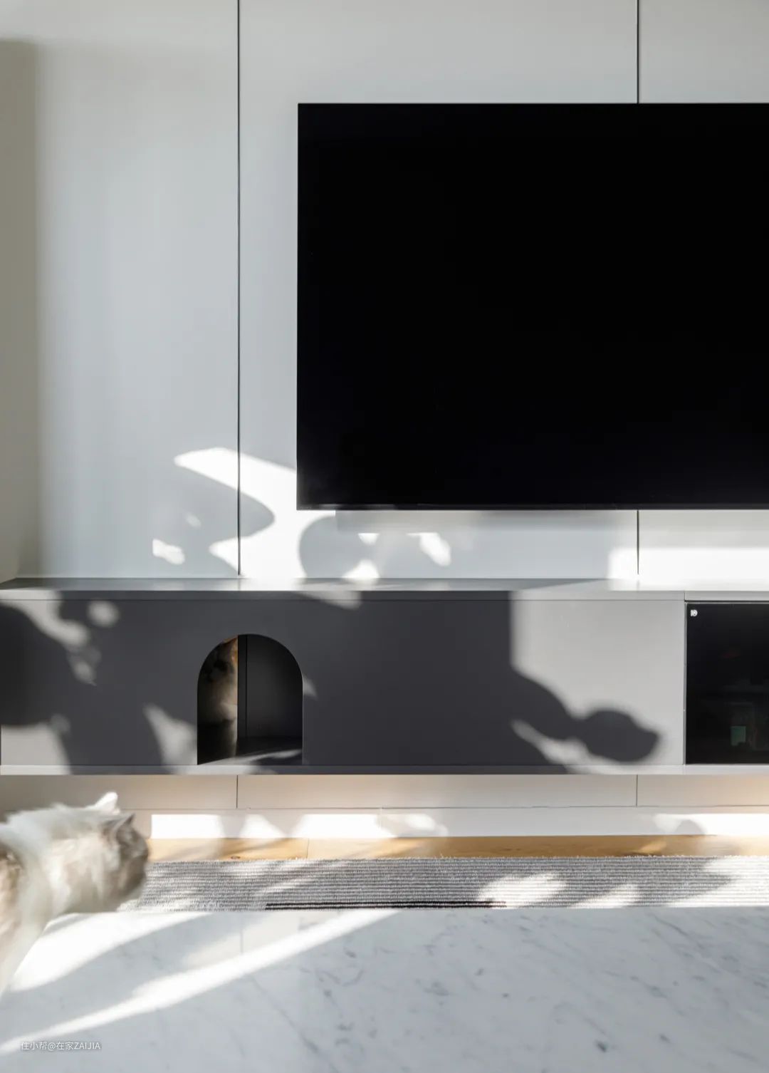 ○ 客厅与主卧由电视柜穿墙相连,其中设置猫咪观察通道;