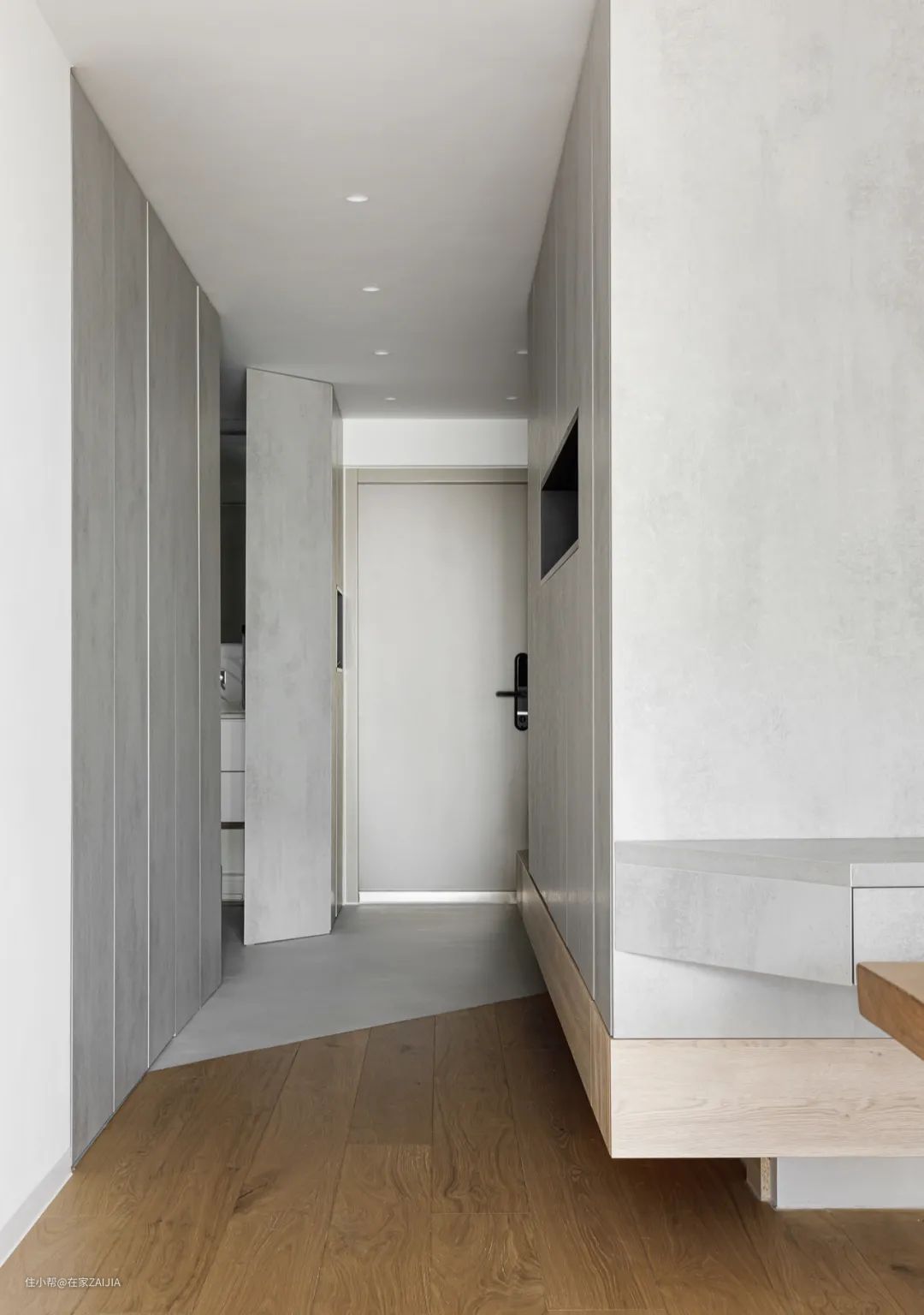 为提升走廊玄关的空间使用率,改造时,我们将卫浴间的墙体内推,新增鞋柜及衣柜收纳区,干区洗手台也被独立出来,地面做了水泥与木地板的拼接,方便日常清洁,在视觉上也起到划分功能区的效果。