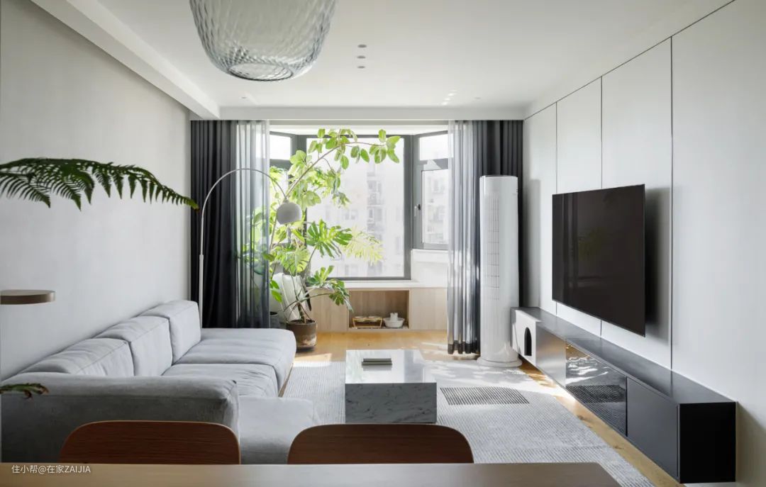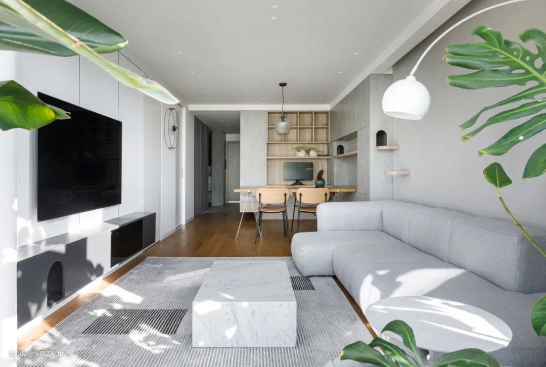 餐厅视角看客厅,是满眼的绿植和阳光,空间整体以简单的黑白灰作主调,沙发背景墙则是用了灰色微水泥来调色。