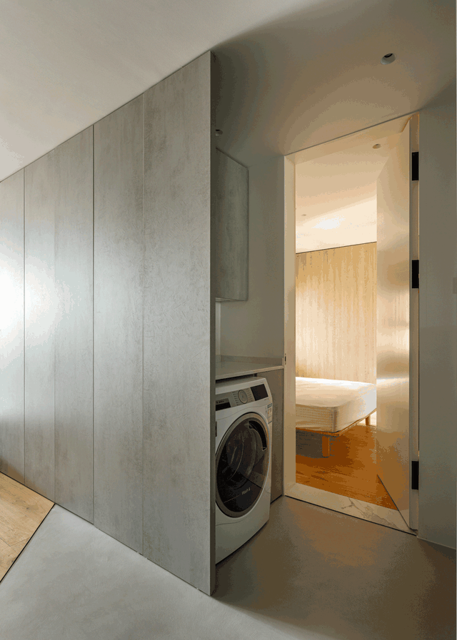 次卧入口靠近玄关,我们将洗衣区设置在这里,水泥地面的设计也便于日常用水。