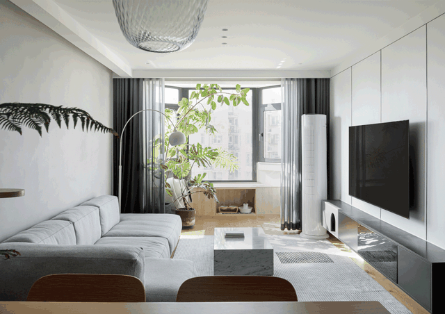 客厅HAY的转角沙发搭配menu的大理石系列茶几,简约大方,左侧的电视柜是直接穿过墙体进入主卧的,一半客厅使用,一半卧室使用。