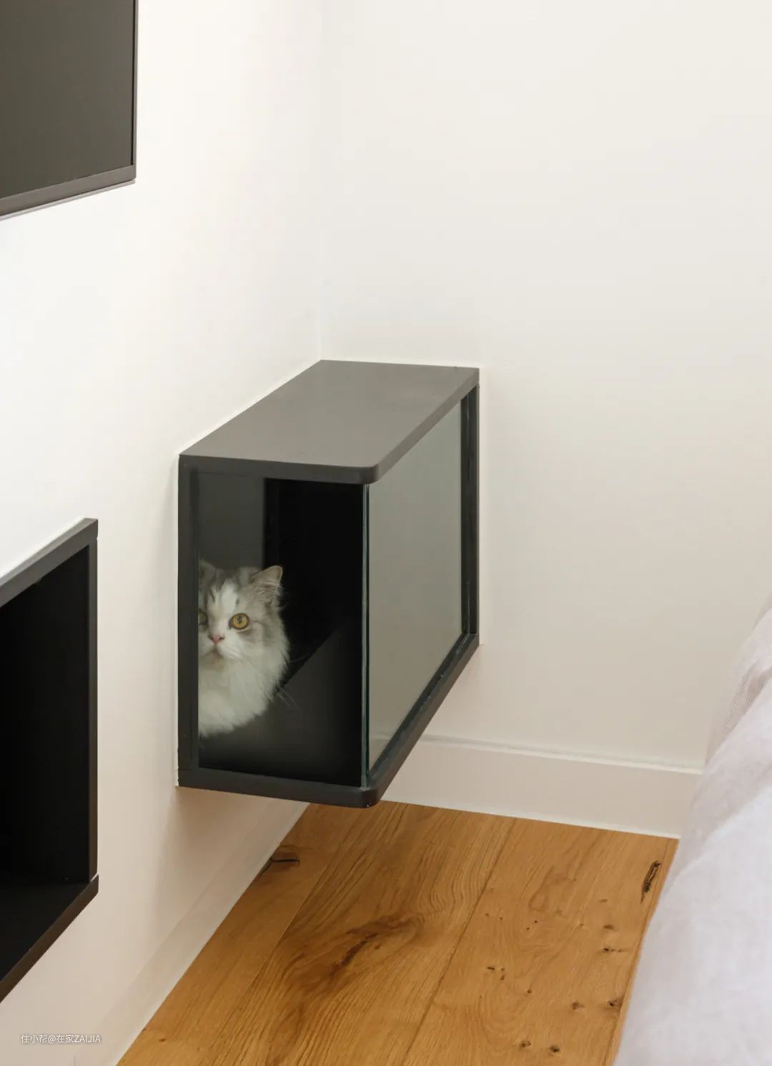 它们可以在客厅隔板处巡视自己的领地,也可以在柜体中间的猫跑道玩耍停留,铲屎官平时在家的时间并不算多,这样一来,在家忙工作时也能相互陪伴了。