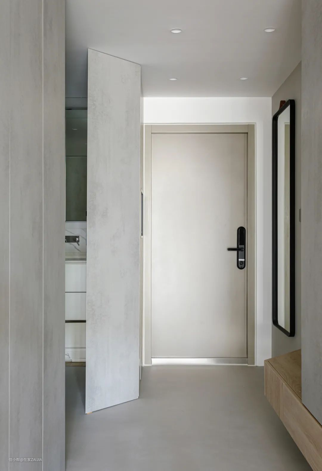 调整后,进门左侧为鞋柜,换鞋-洗手动作一气呵成,右侧木色的部分是与衣柜一体的换鞋凳。