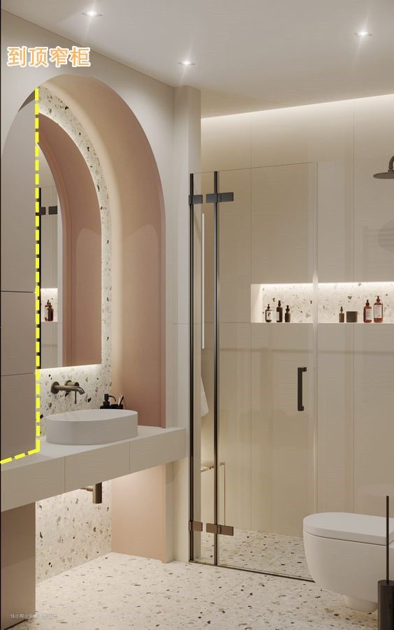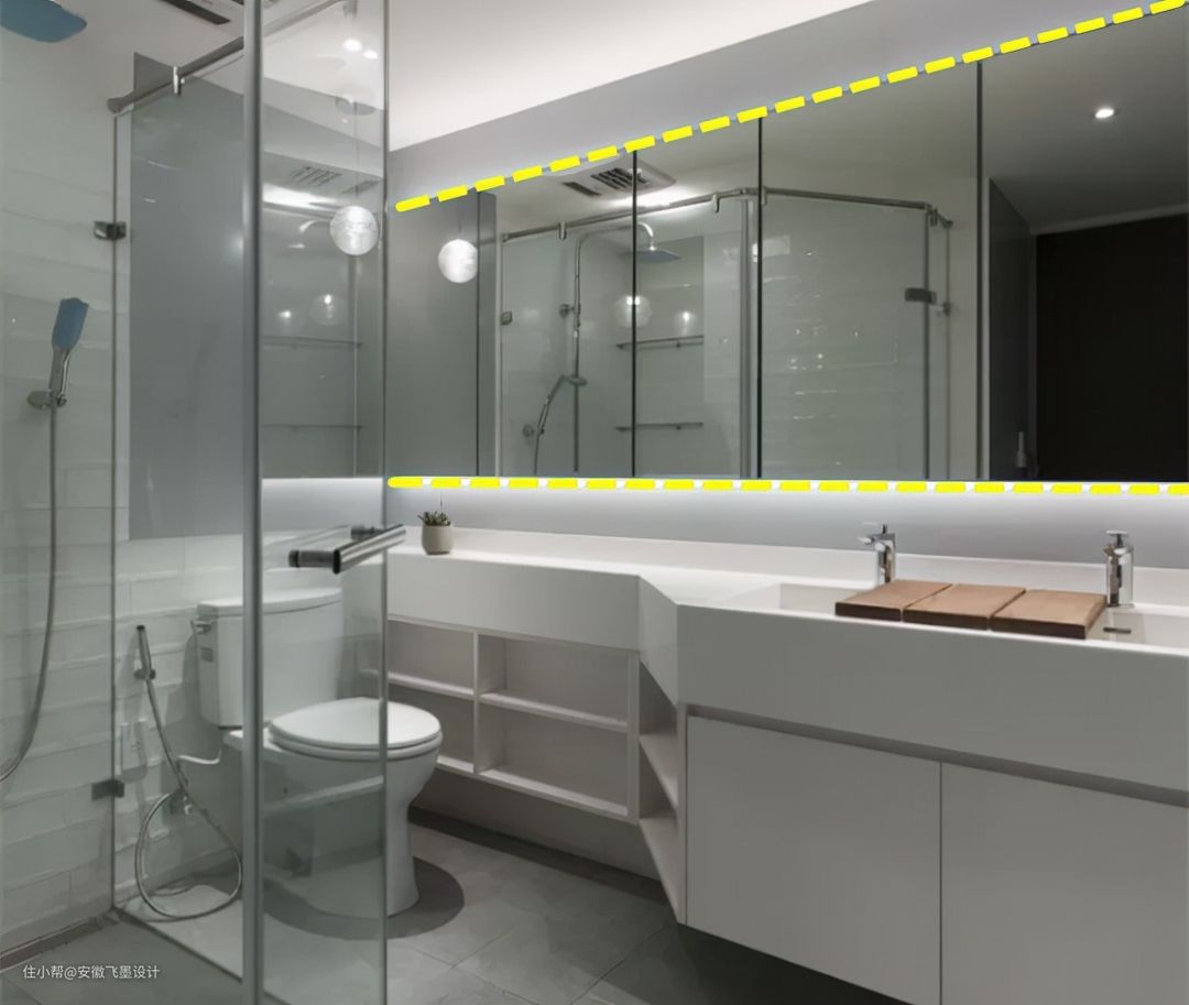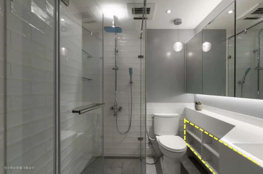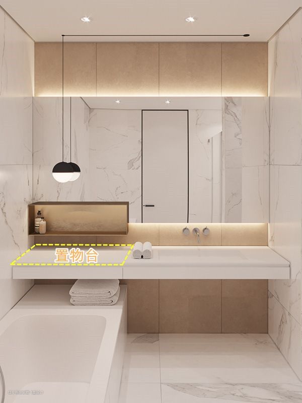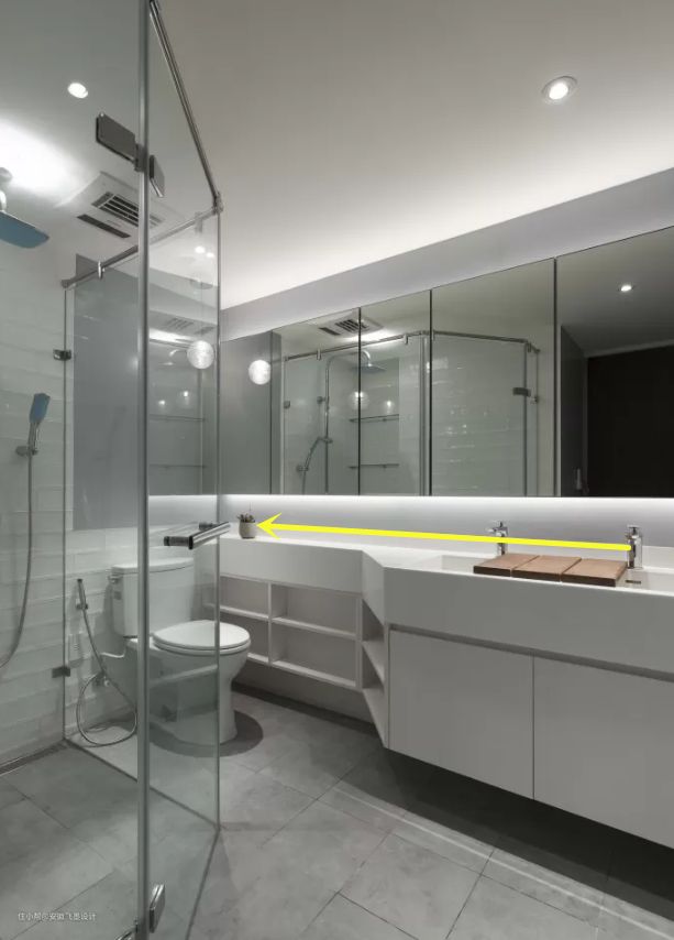 这种布局比较简单,直接给洗漱台部分做悬空的部分延伸即可,多出的区域可以当做存放化妆品的空间,下方无遮挡的话,还可以当做梳妆台使用。
