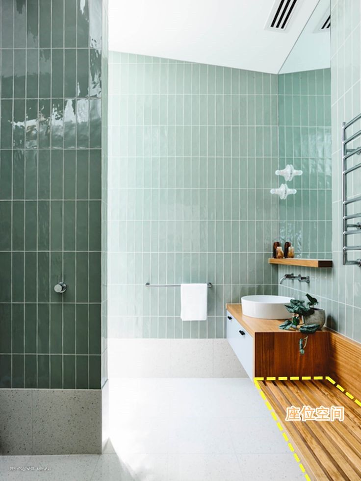 有的家庭有老人和孩子,洗澡可能会有滑道的风险,我建议利用洗漱台延伸一个格栅淋浴凳,兼顾沥水和座位功能,洗澡累了还可以坐在这里休息,非常人性化。