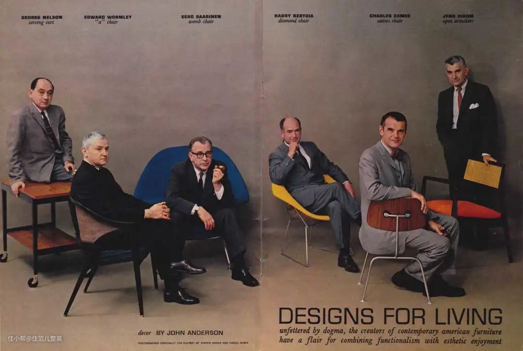 上世纪五十年代的六位设计大师与他们的作品,其中左二~四坐的就是他们各自设计的lounge chair,此照片刊登在1961年7月号《花花公子》。