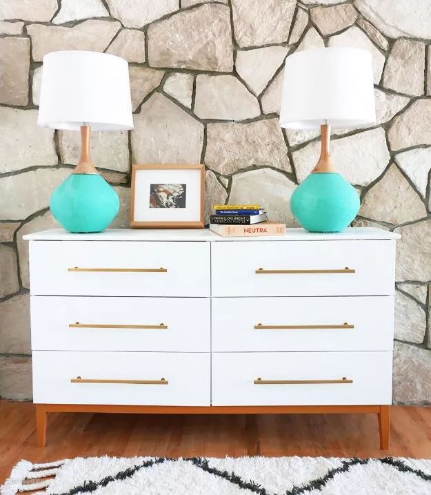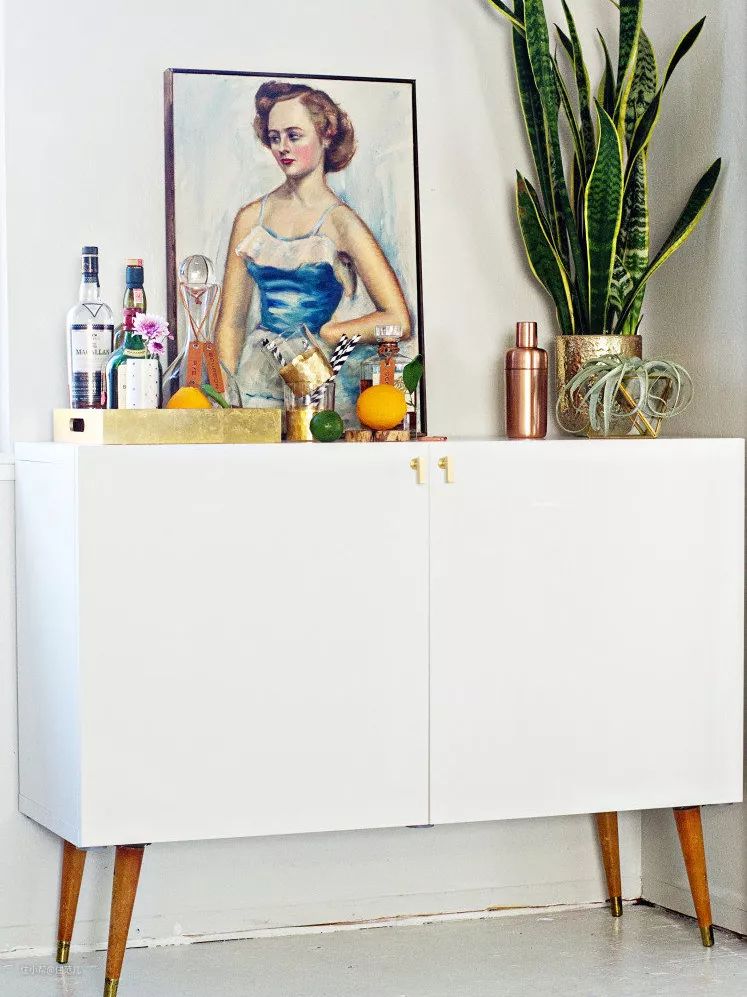 像宜家的 Besta 橱柜,将原有的方形柱腿换成锥形木腿,同时增加黄铜把手,一下就有了复古的韵味。