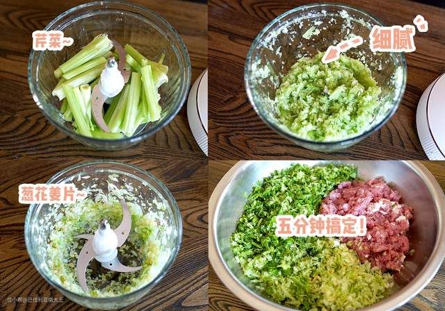 切菜也是,这捆芹菜我只需要洗好,扔进绞肉机选一档碎菜,很是细腻。算上绞肉和葱姜的时间,全程不到五分钟,一盆芹菜猪肉水饺的馅料就准备好了。