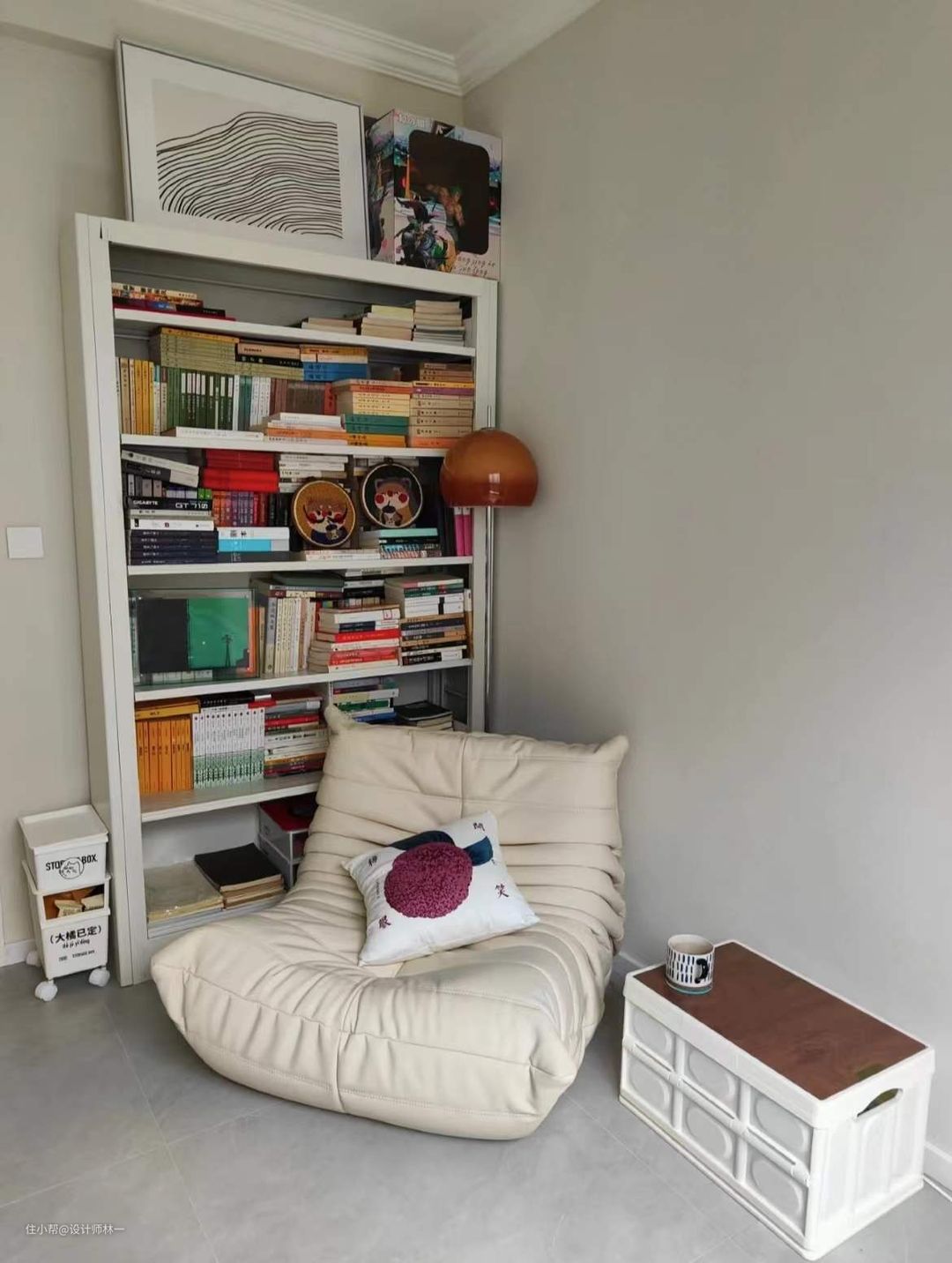 墙脚设计为读书角,放置了毛毛虫沙发,可以根据空间大小和自己喜欢的颜色进行随意搭配和组合,多条褶皱构成的慵懒光是看到就让人非常放松,在角落里角落,一杯咖啡一本书,私享与自己独处的时光,非常惬意。