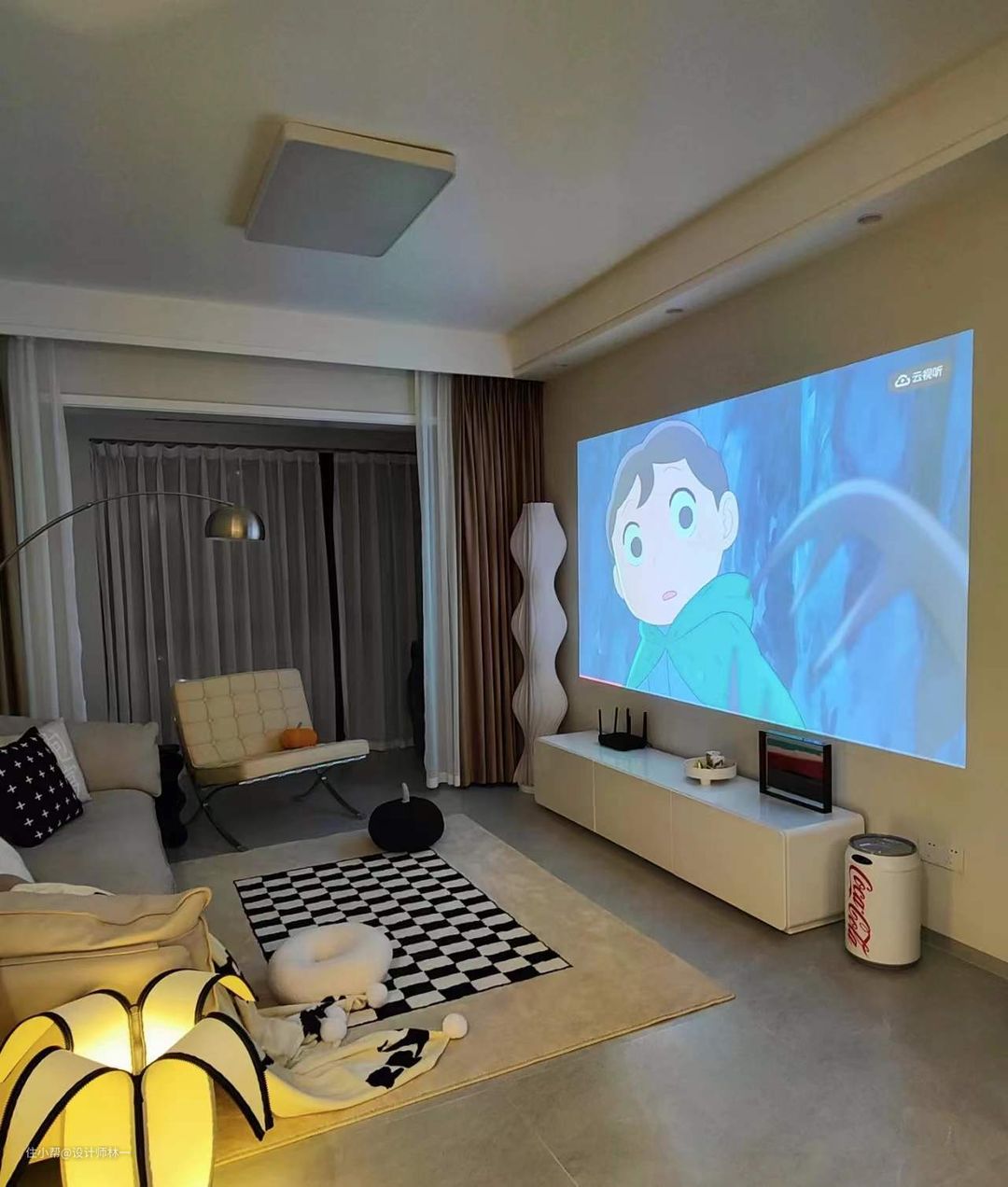 没有使用电视,而是采用了投影仪,3m的距离就可以投120寸,很适合小户型,白天没有拉窗帘馆看起来也毫无压力,而且还没有电视屏幕的反光,晚上更合适,一打开就有家庭电影院的氛围感啦!