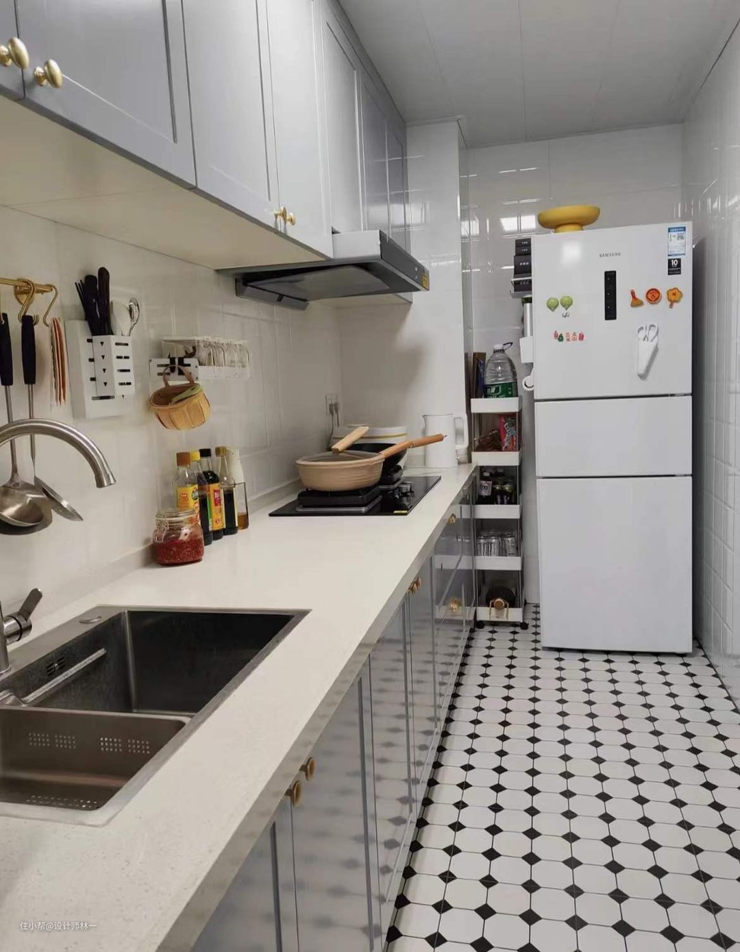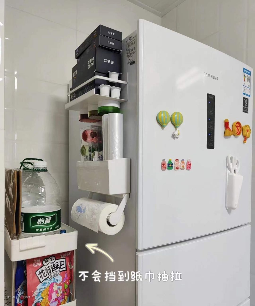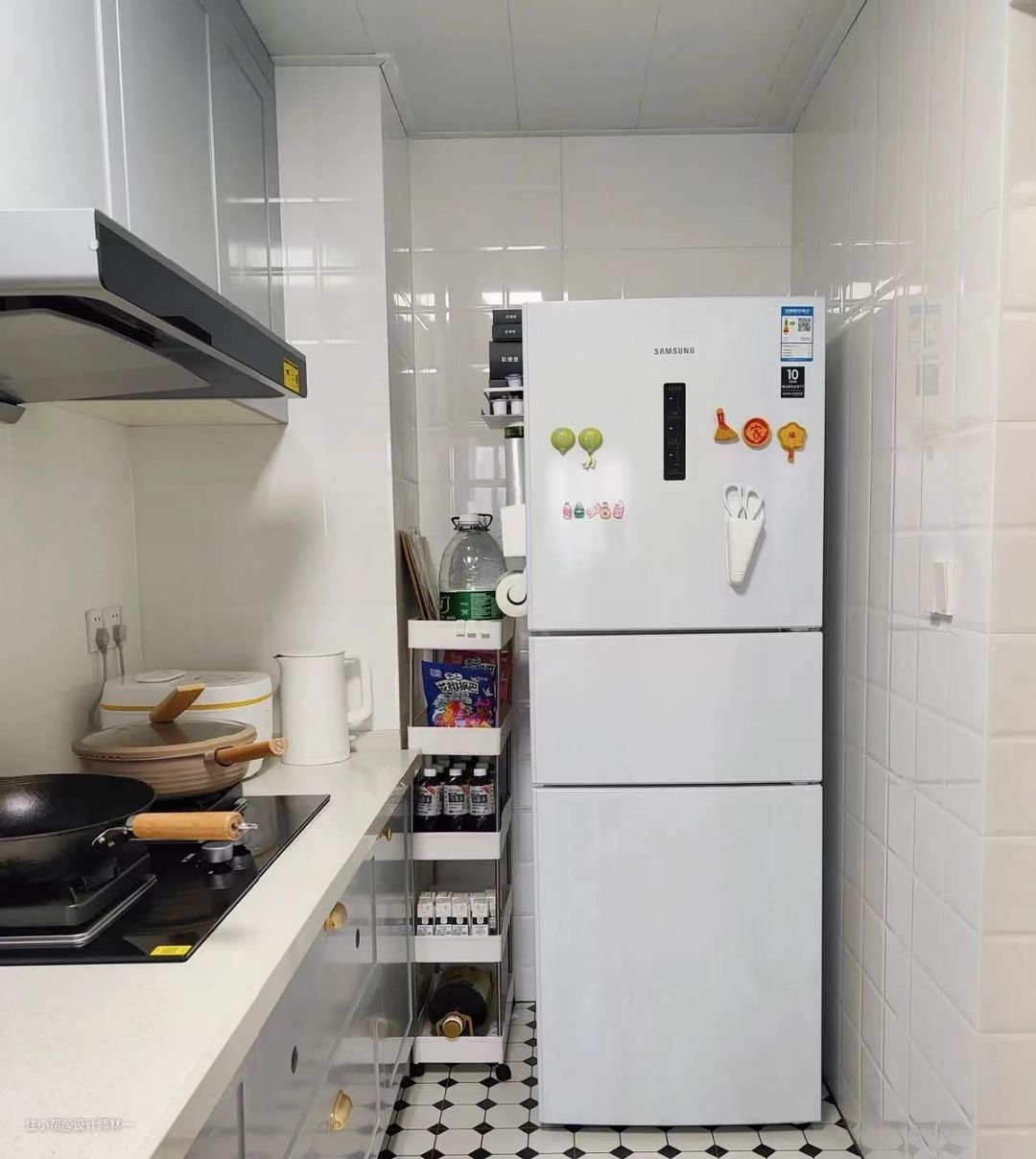 冰箱侧面也做了免打孔的收纳,将每1㎡都极致利用起来。